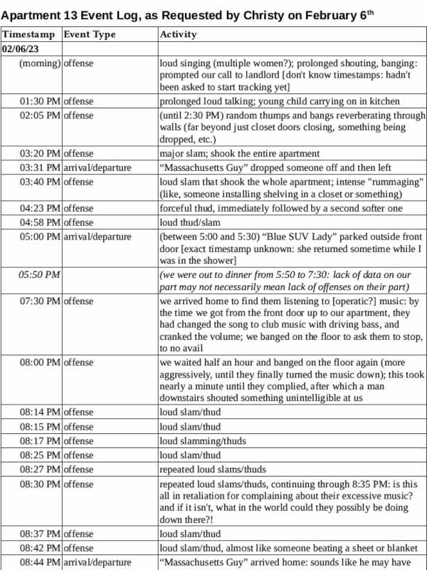 The woman in the leasing office was tremendously sympathetic to our plight and asked us to log any offenses going forward, as she was going to call the savages downstairs and tell them there had been numerous noise complaints against them.