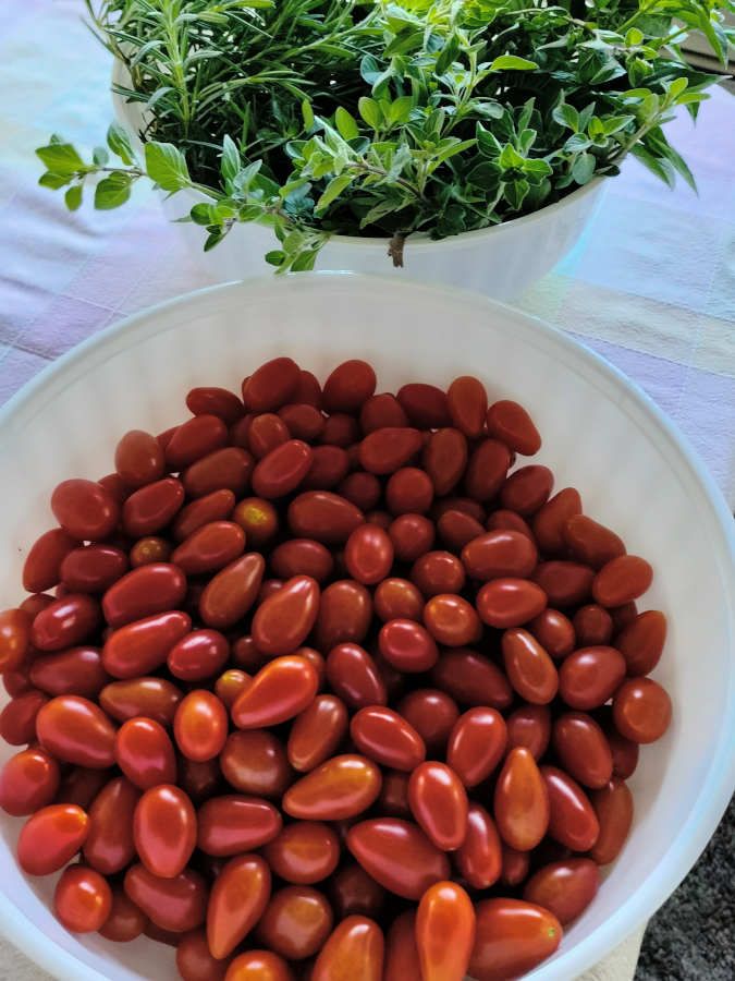 Then Kevin and I harvested a TON of stuff from the garden. A giant bowl of cherry tomatoes, and as much basil, oregano, rosemary, and lemon verbena as we could carry: