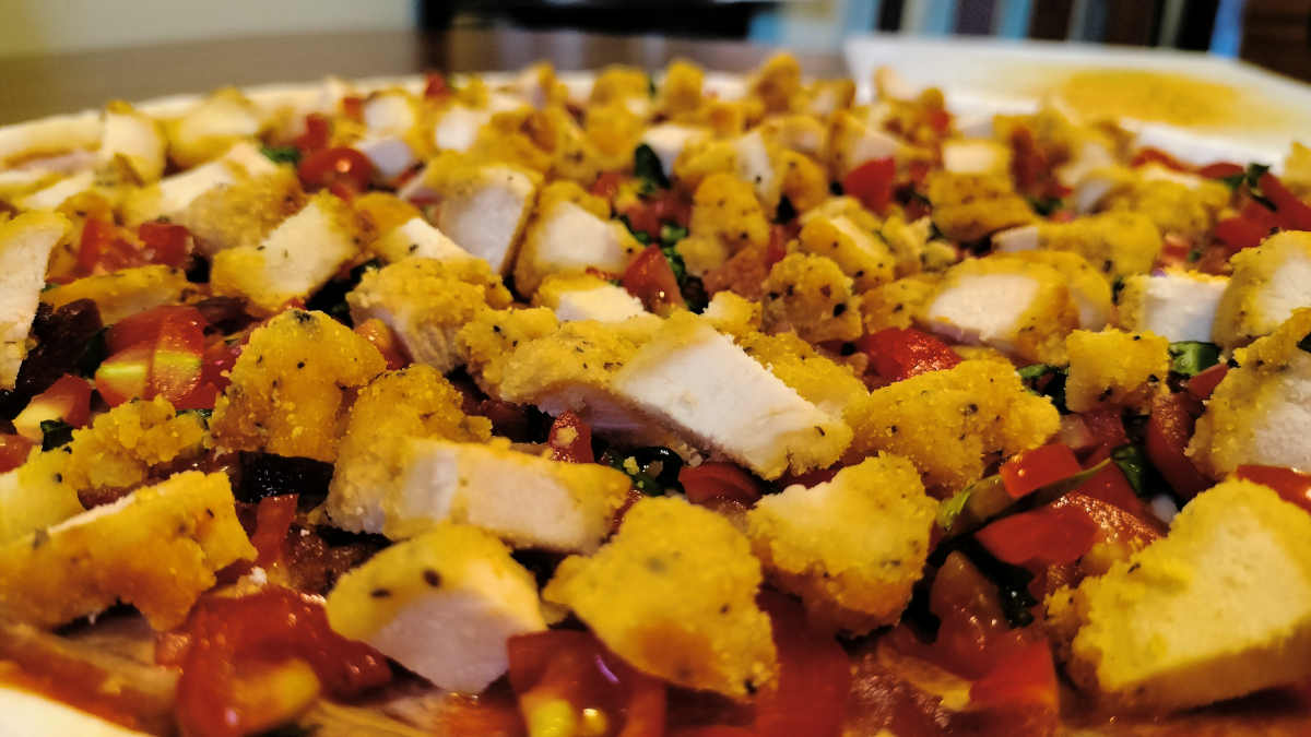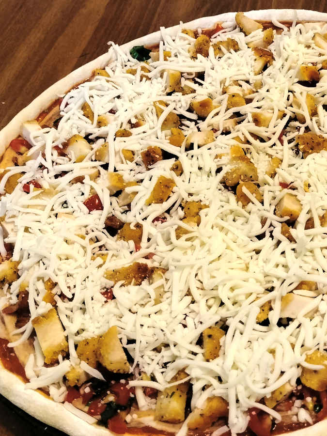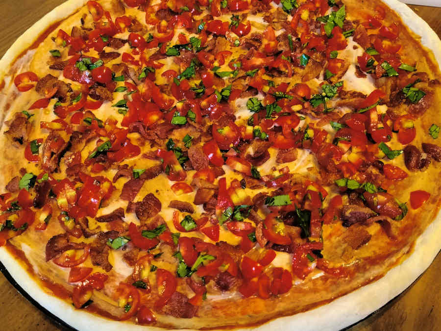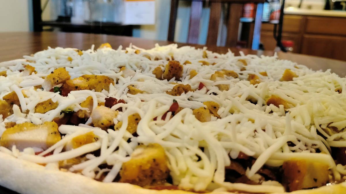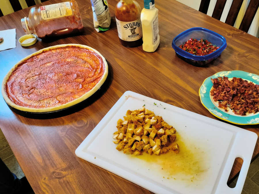 So I fried up half a pound of bacon while he cubed about that same amount in chicken tenders we had left over from a few nights prior. And then he chopped up a bunch of our tomatoes and some of our basil while I rolled out the dough and shaped the crust: