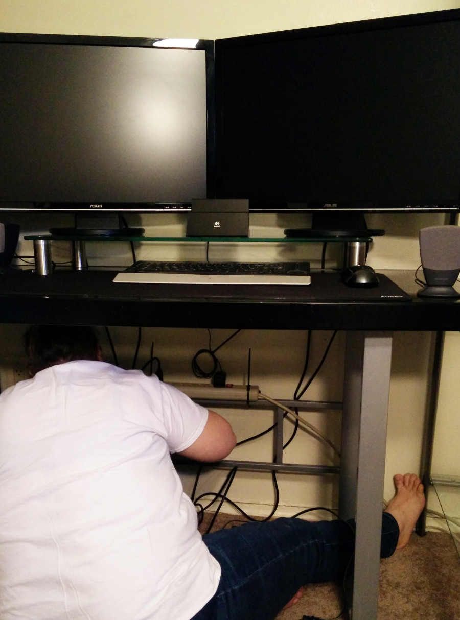 We spent Sunday getting things unpacked and situated. Nothing terribly fascinating to report on, although Athennia confessed that the chaotic mess of cables behind my desk has always driven her crazy; so, I let her take charge on routing everything. (She does have five years' experience routing and splicing optical fiber, after all.)