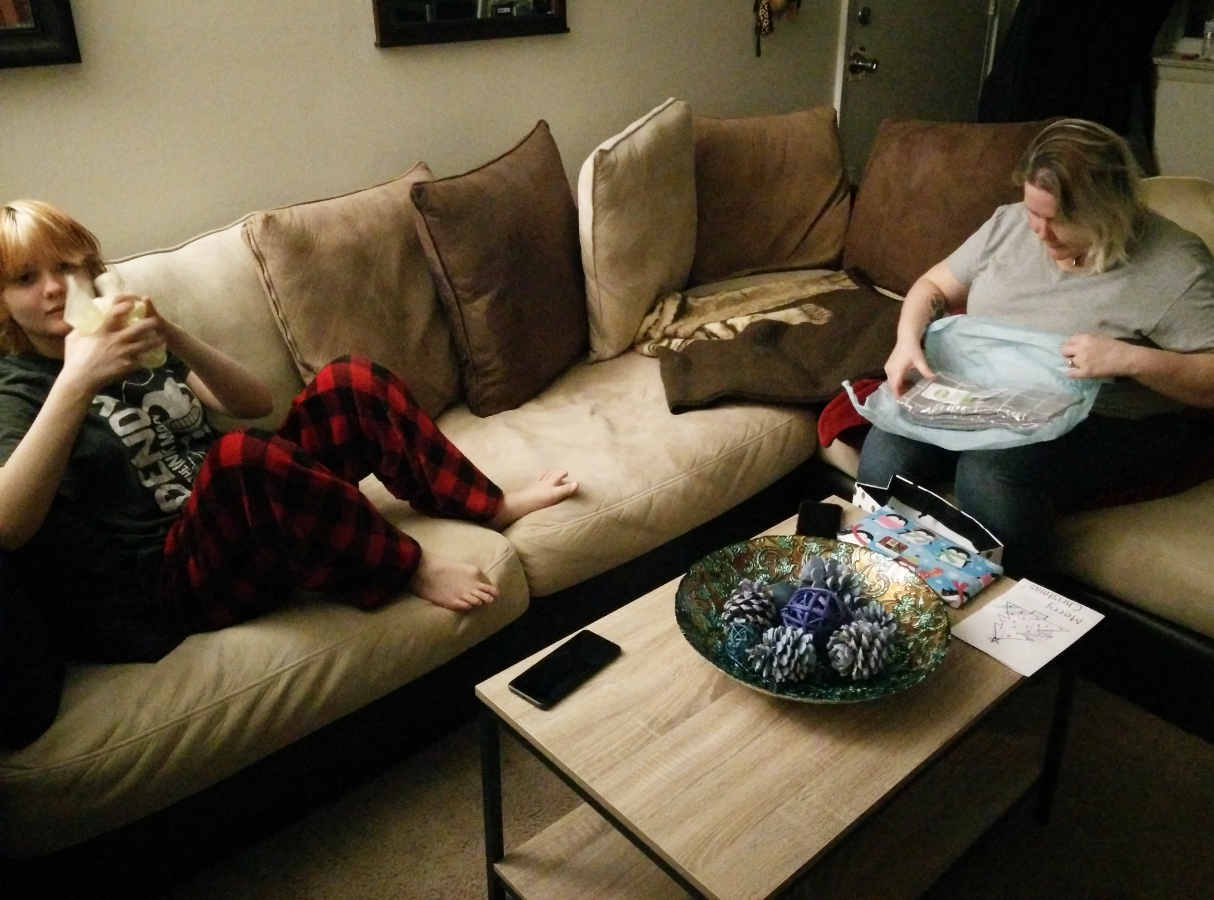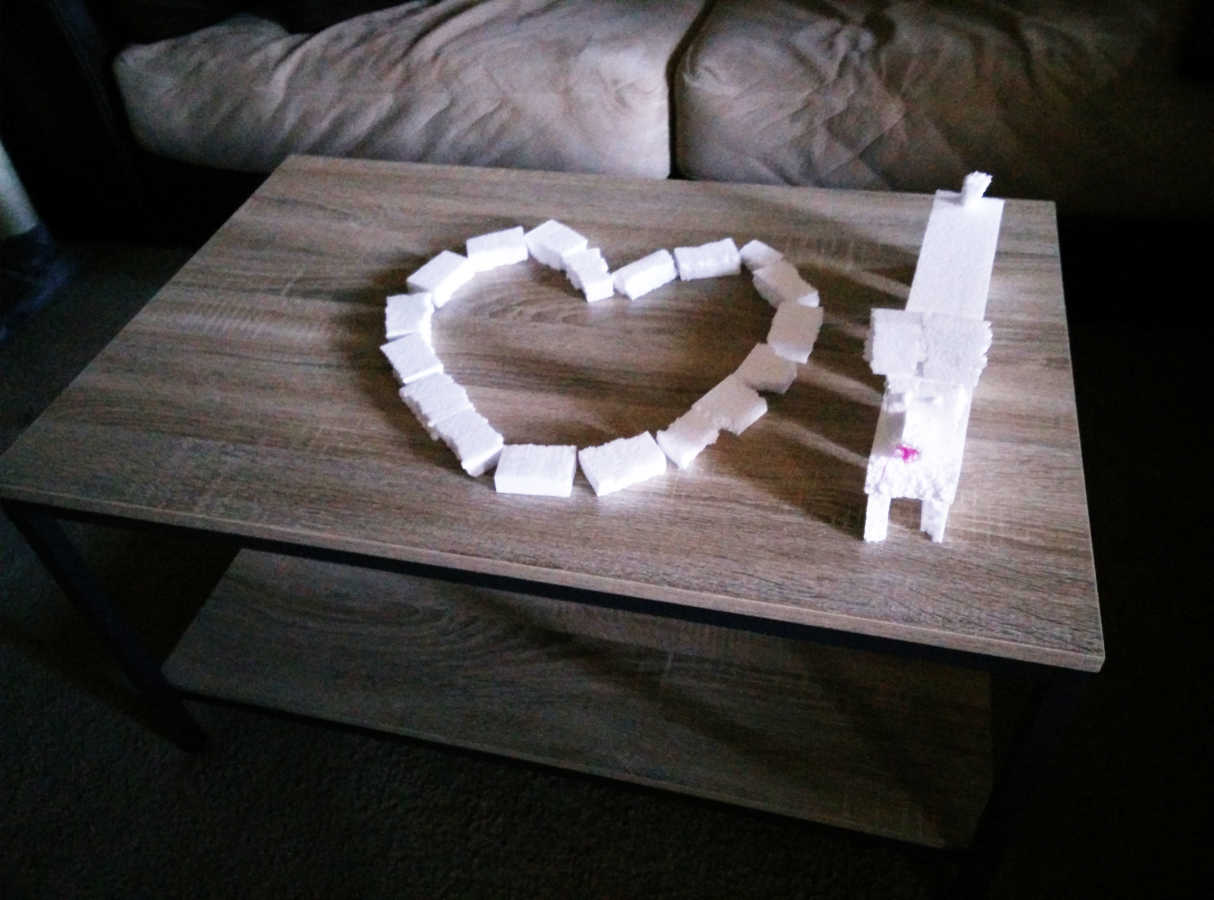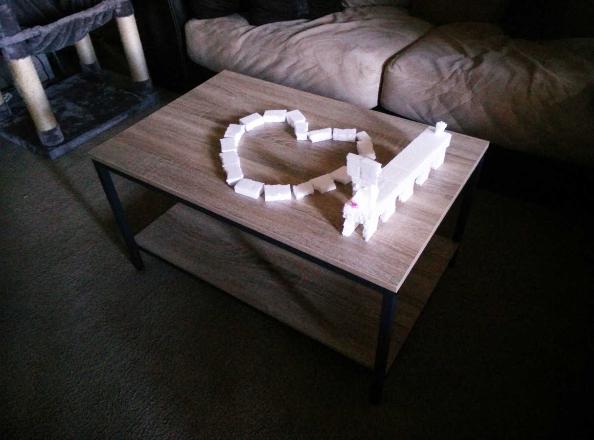 Monday afternoon, I put together a coffee table I had ordered and smuggled inside and under Riley's futon while Athennia wasn't looking on Saturday. Meanwhile, Riley used the styrofoam packaging to construct some things of her own...