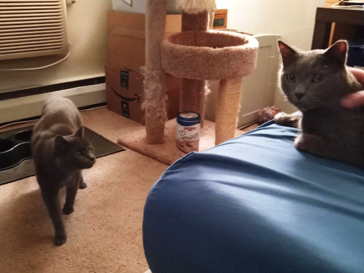 It's been a bit slow-going, but generally headache-free so far: Lucky seems perfectly content with Penny; and, while she doesn't exactly like him yet (and hisses when he gets too close), she's neither afraid of him nor going out of her way to torment him.