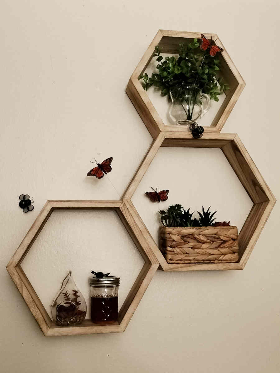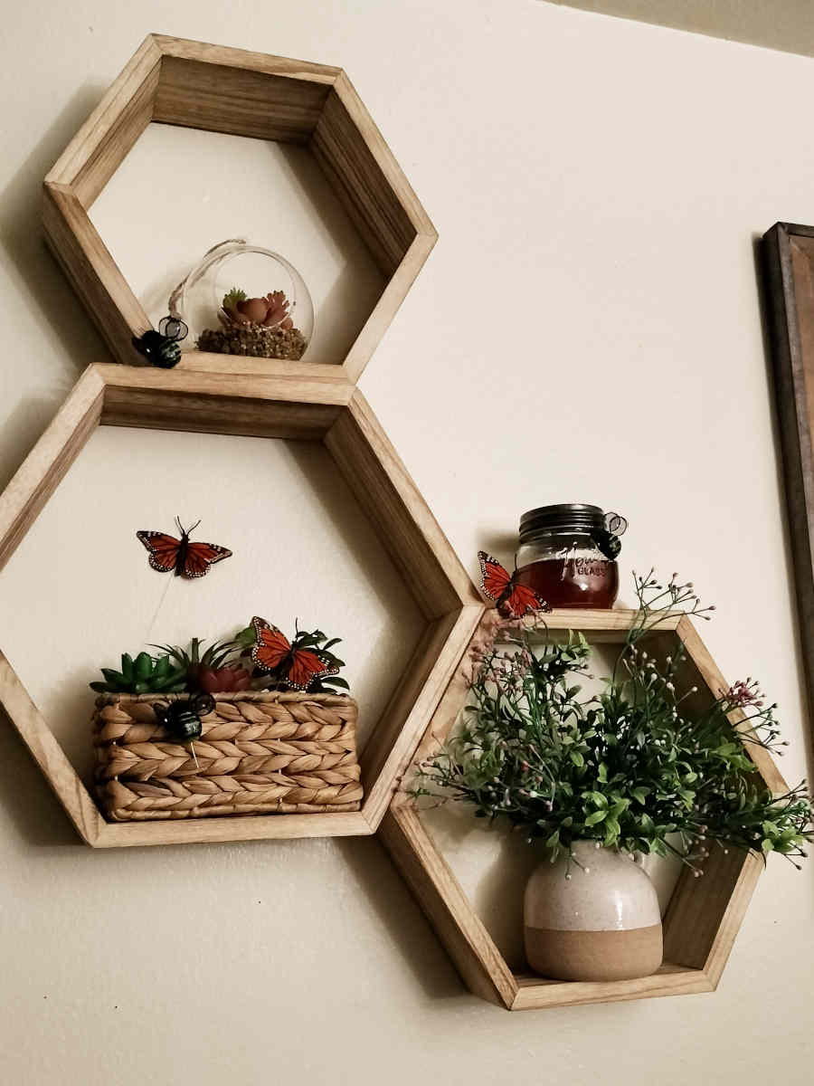We had ordered some hexagonal shelves earlier in the week and had them shipped to Kevin's parents' house so they wouldn't get porch-pirated. So with those in our possession, we spent Sunday afternoon doing lots of measuring in preparation to install them.