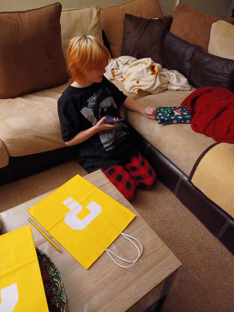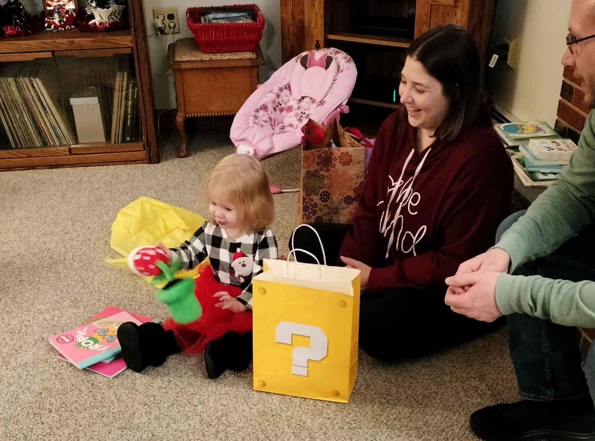 We kicked off the gift exchange by giving Olivia and Hannah the Super Mario themed plushies we came across at Barnes & Noble a few weeks ago: Hannah got a mushroom to help her grow, Liv got a piranha plant to help ward Hannah off when she gets a little bigger, and we wrapped them in a pair of "item block" question mark bags that I just barely finished designing in the nick of time before bed last night :)