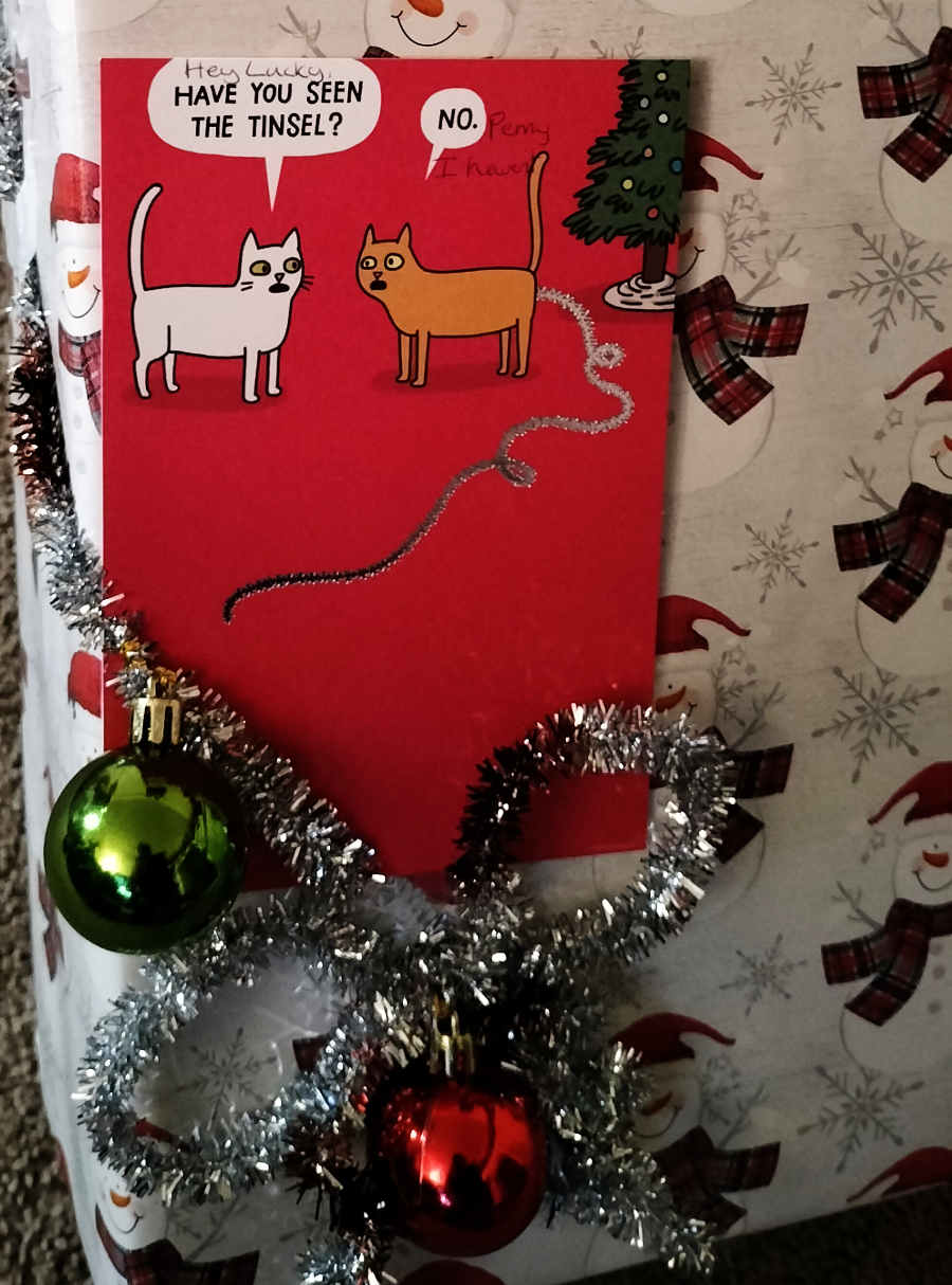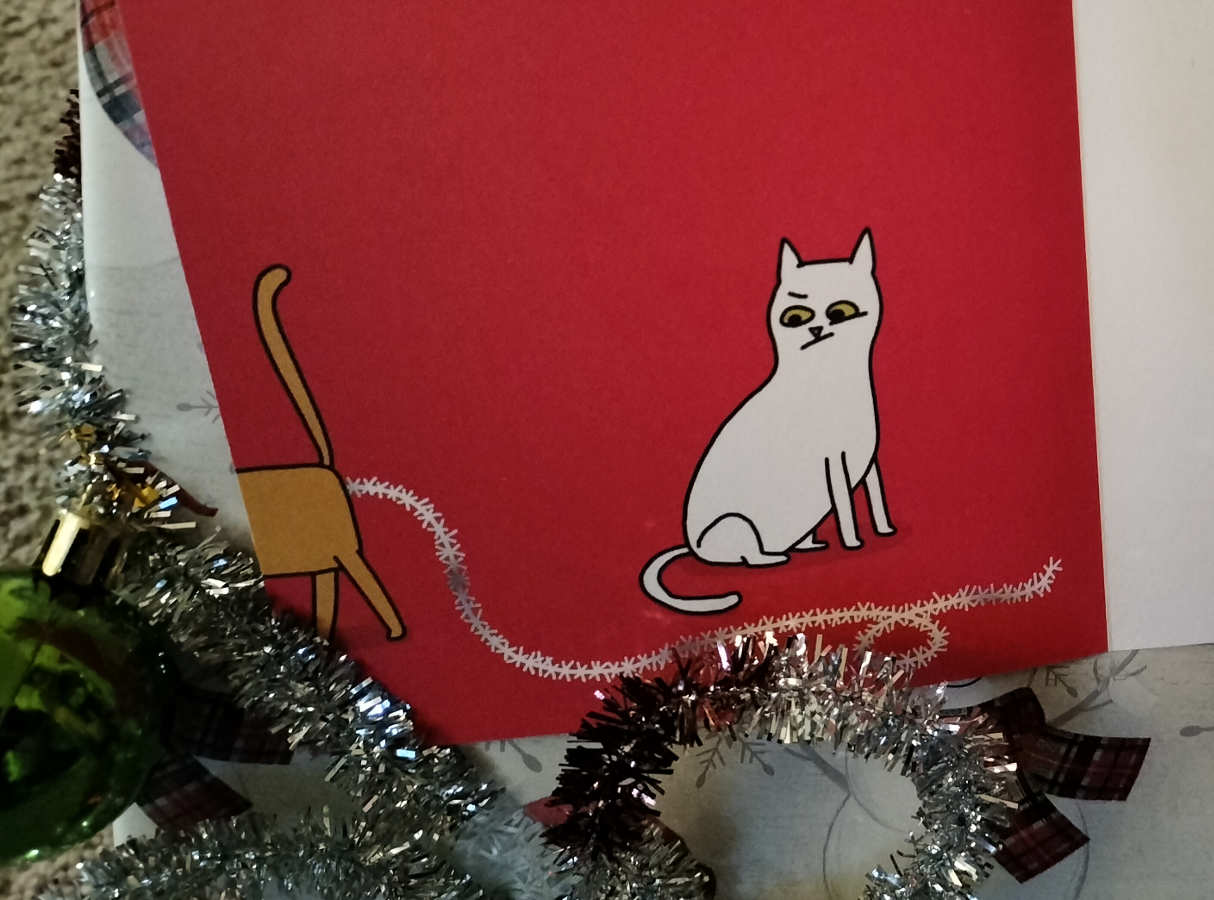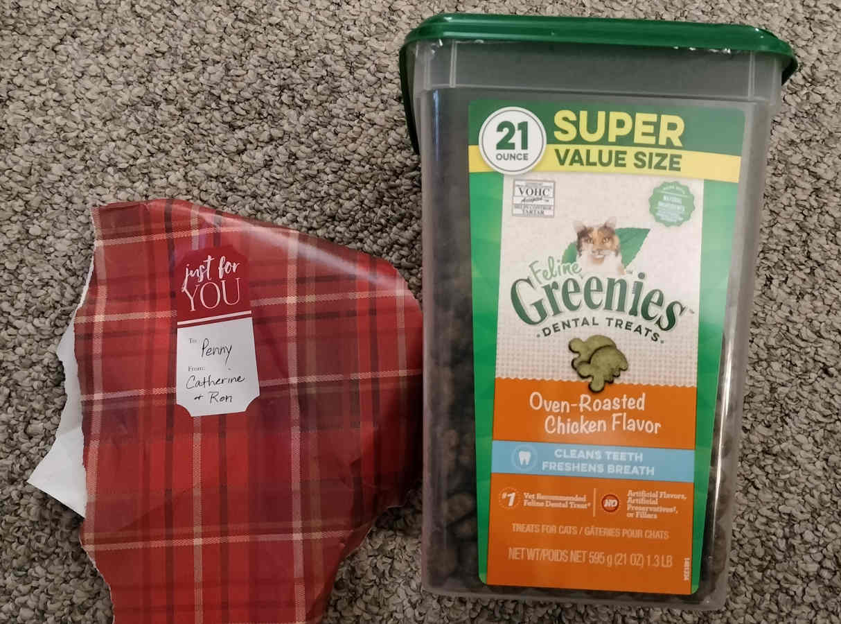 Then it was Riley's turn to open something. We gave her a lavender scented cat plushie that can be microwaved and used as a heating pad. And I had found a great card, so I did some custom wrapping and made a few "touch ups" with a brown Sharpie marker: