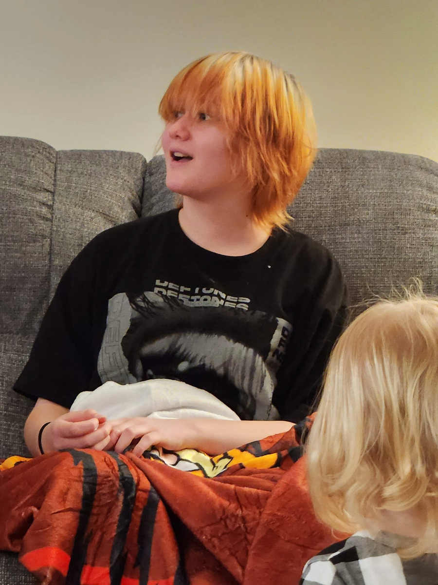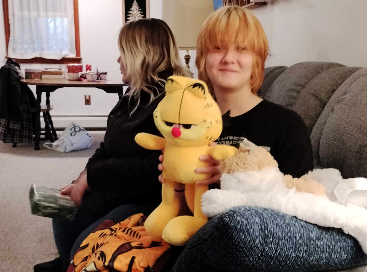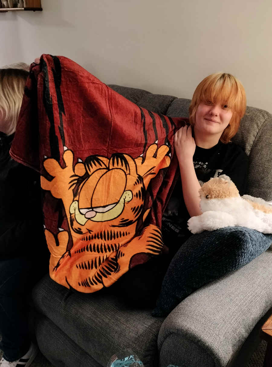 Riley's a die hard Garfield fan, so Kevin's parents got her a Garfield plushie, and Kelly and Steve got her the most vibrant blanket to match (along with a giant assortment of candy, which I didn't get a picture of).