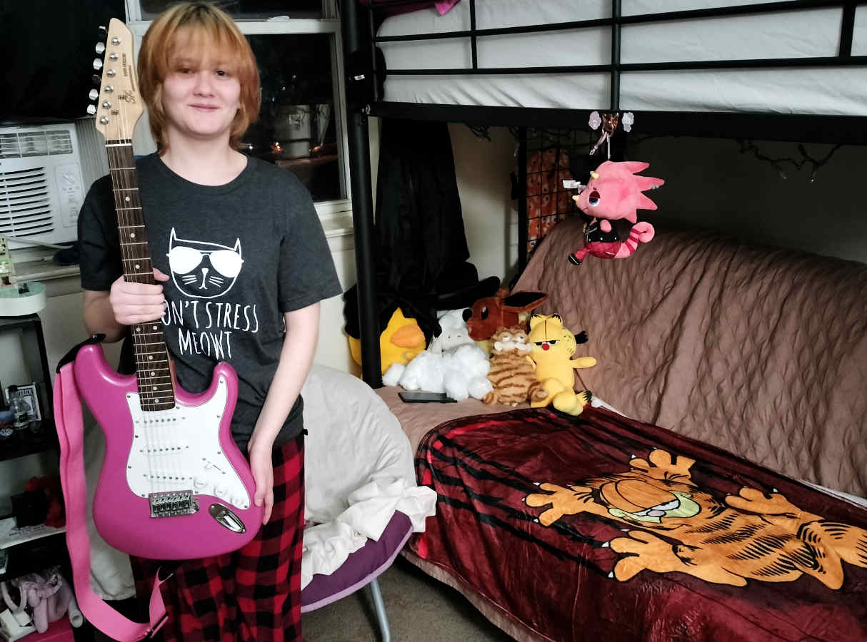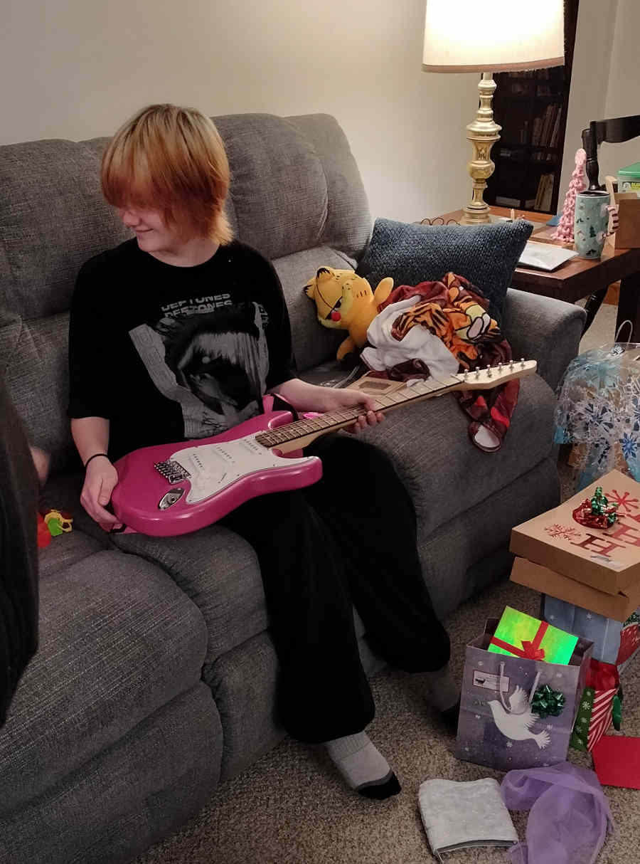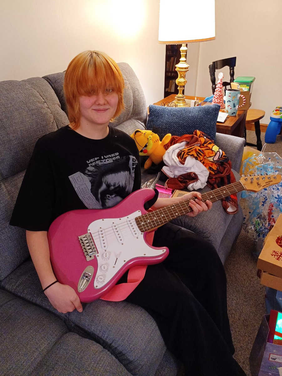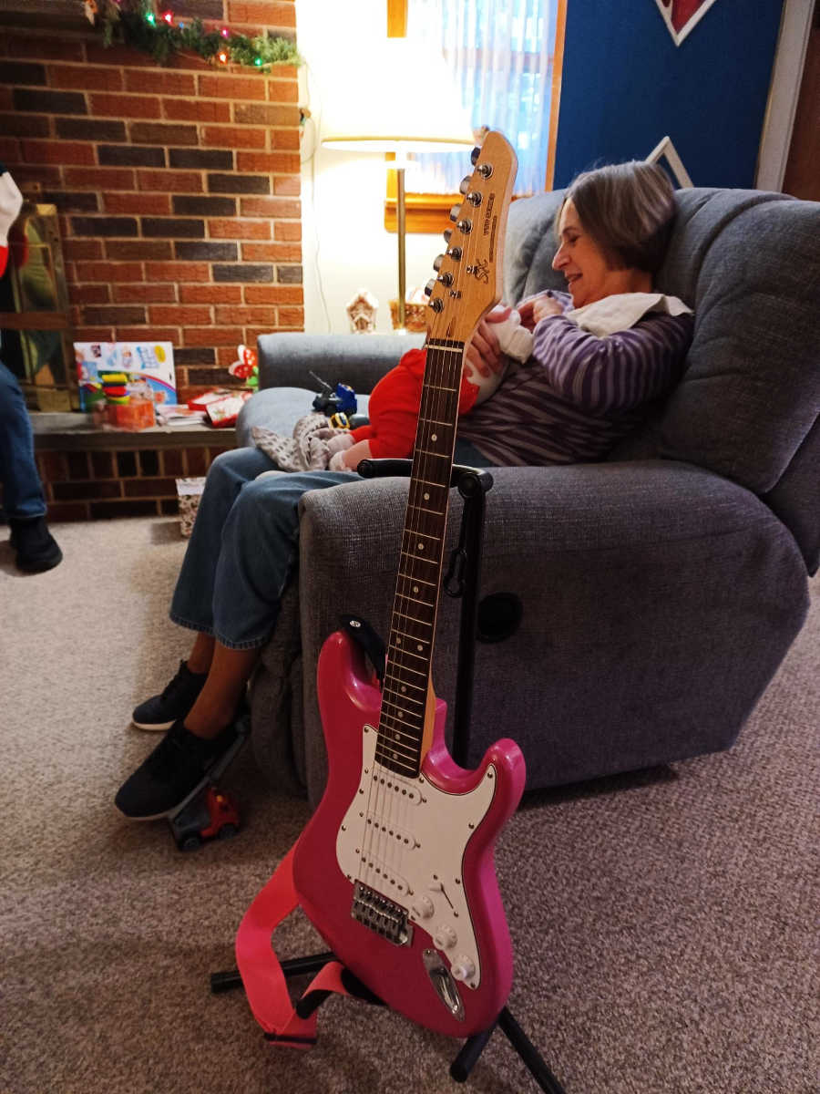 After listening to Riley lamenting for months that she desperately wanted a guitar but knew she wasn't getting one because "they're so expensive," we finally got to give her the guitar Kevin had found even before Halloween had rolled around :D