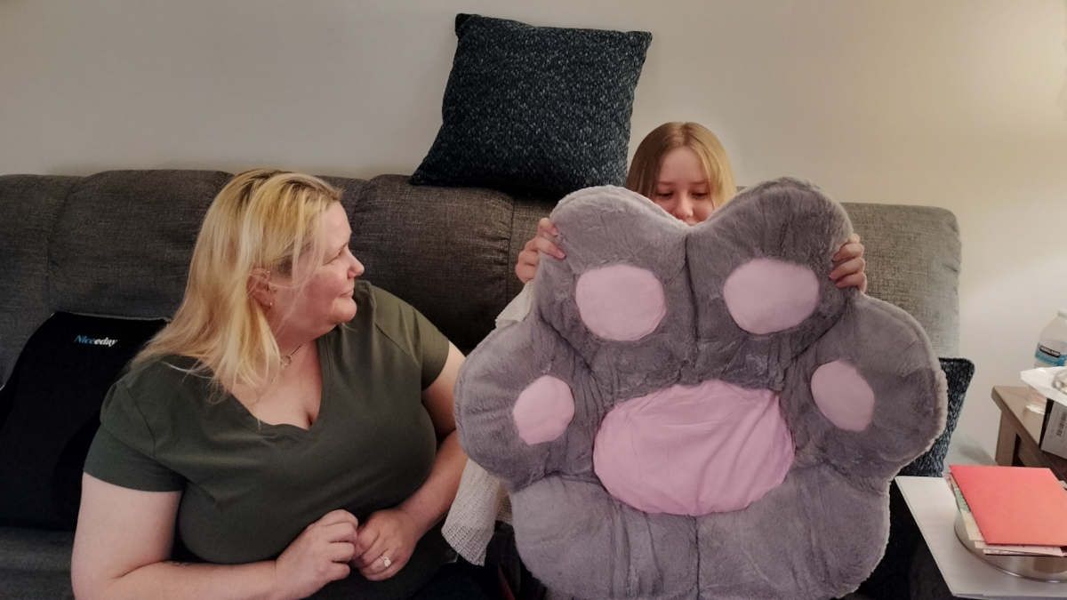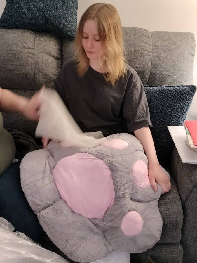 And then Athennia gave her a cat's-paw-shaped cushion for her desk chair...