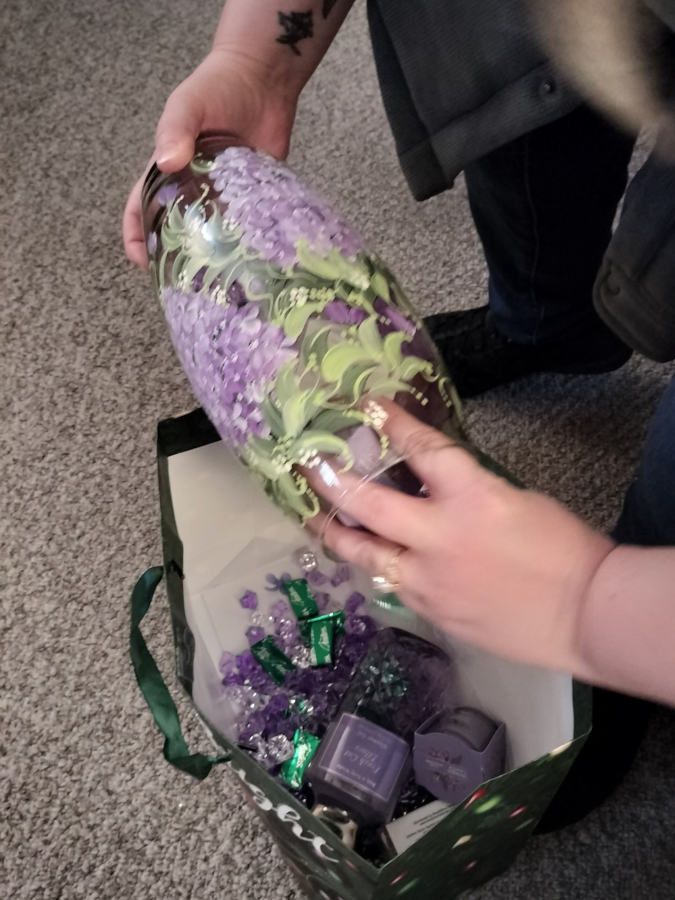 Some lilac soaps and shower gel, a couple Yankee candles, a decent supply of Andes mints... and some faux-amethyst crystals I'm sure she'll have no problem repurposing into a piece of decor around the house.