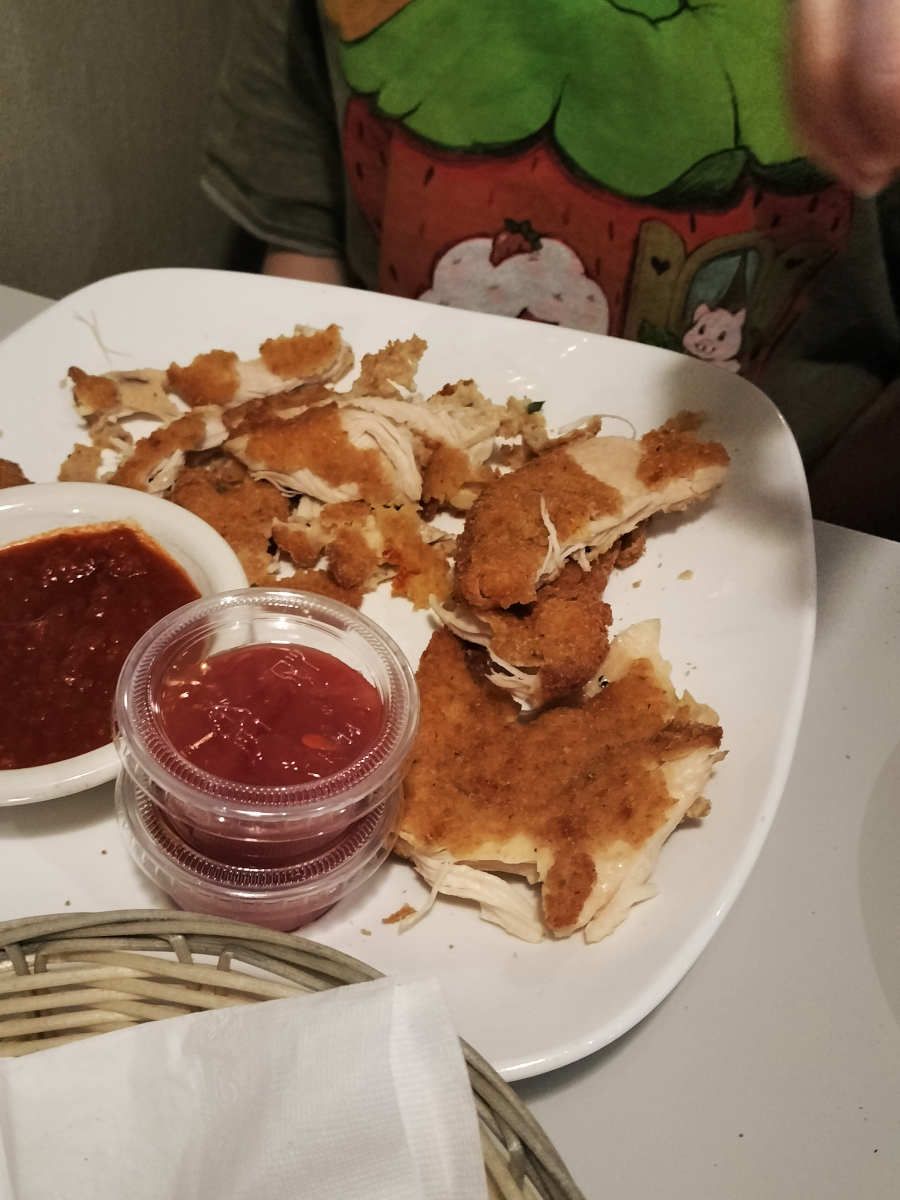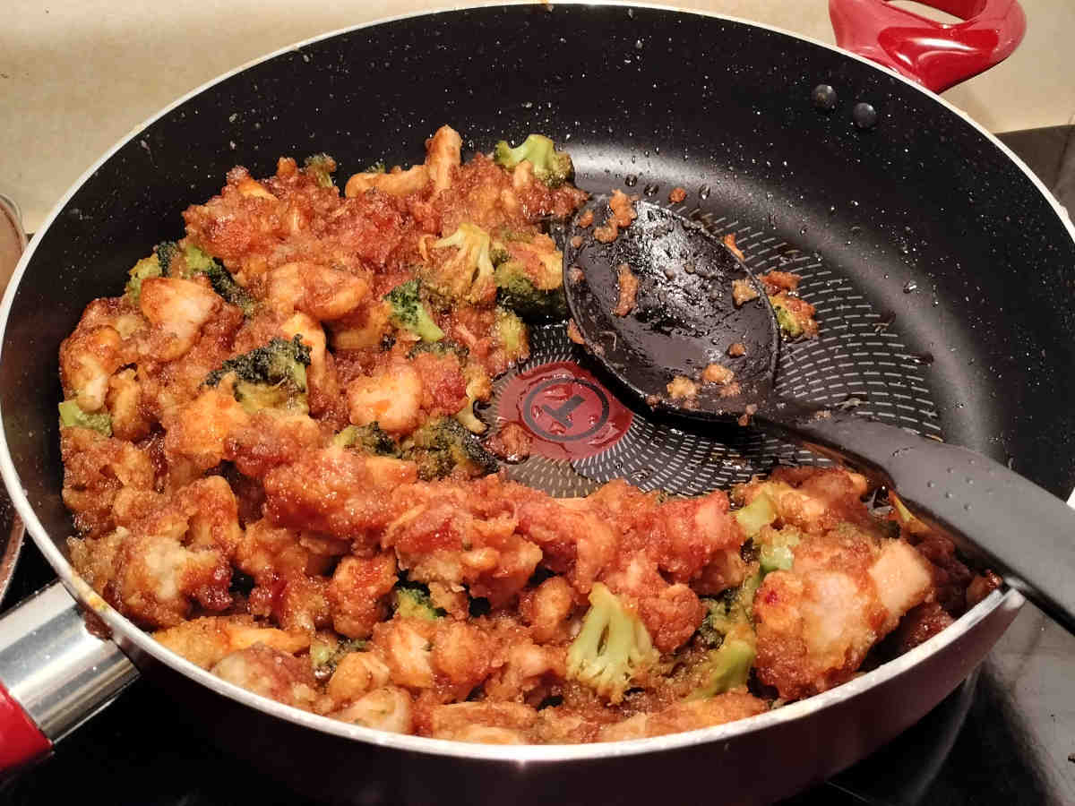 I jumped in and took care of egg washing and breading the chicken so I could cook it, and we tossed in some broccoli near the end. Everything came out delicious!