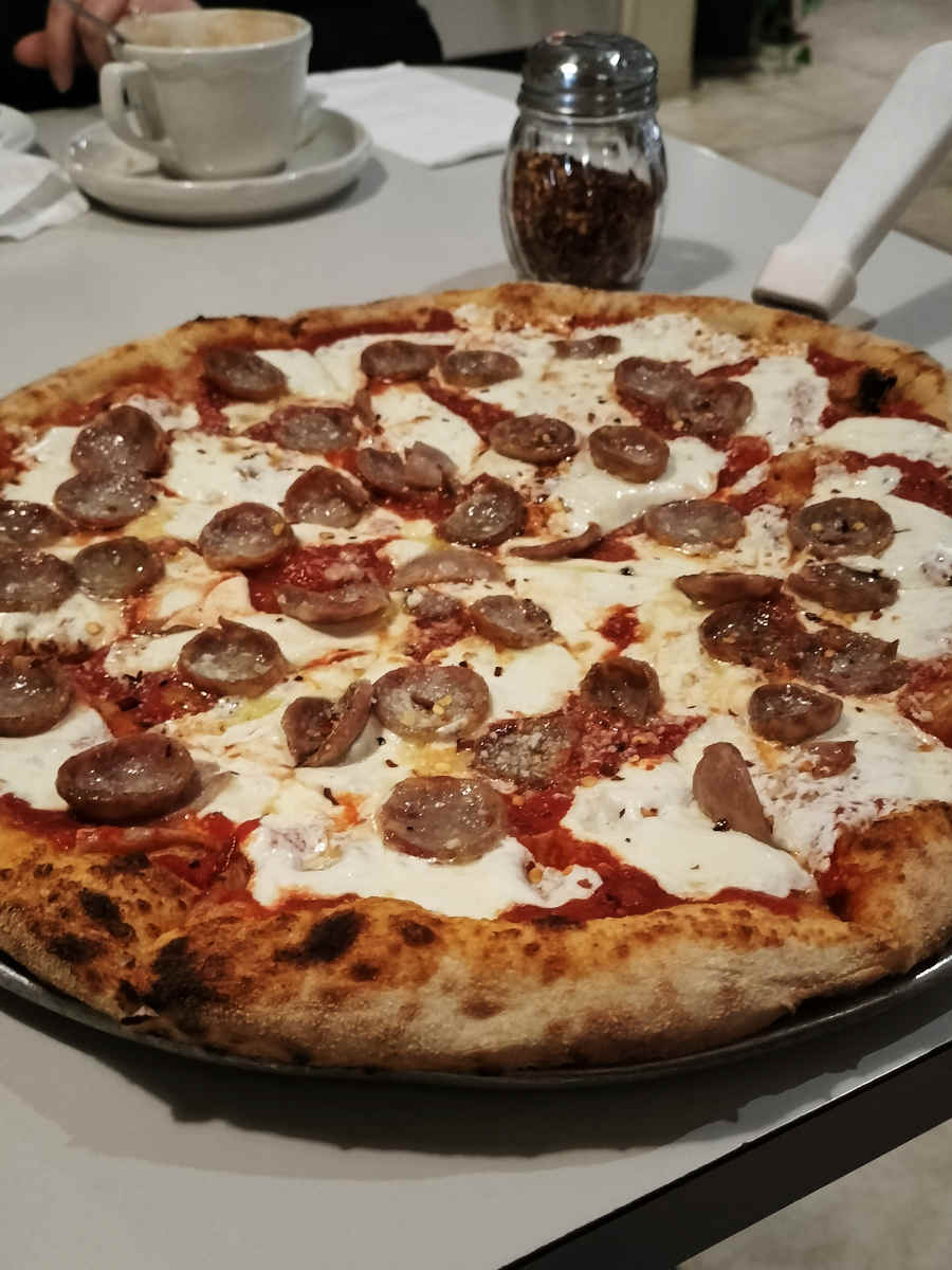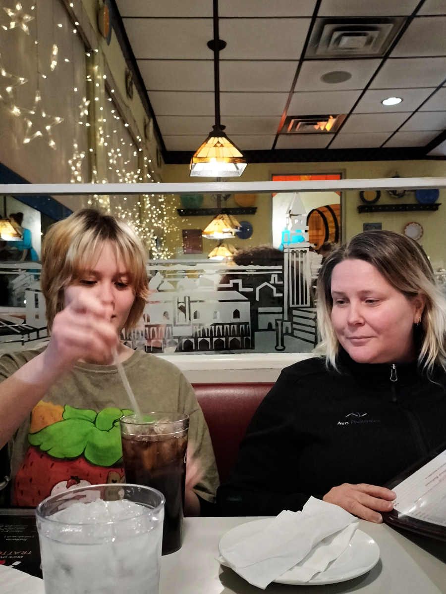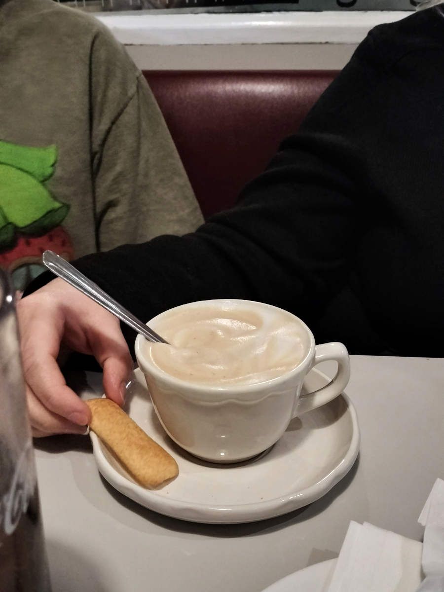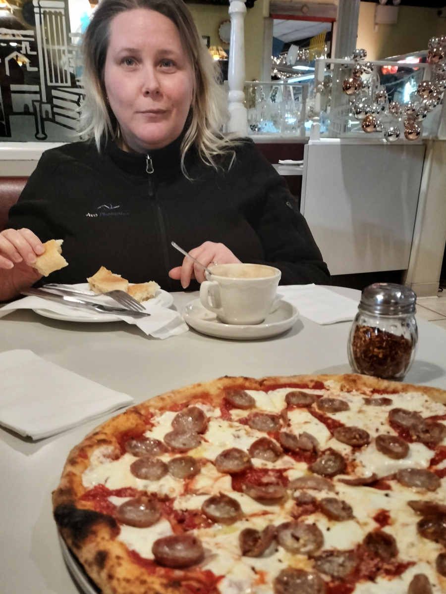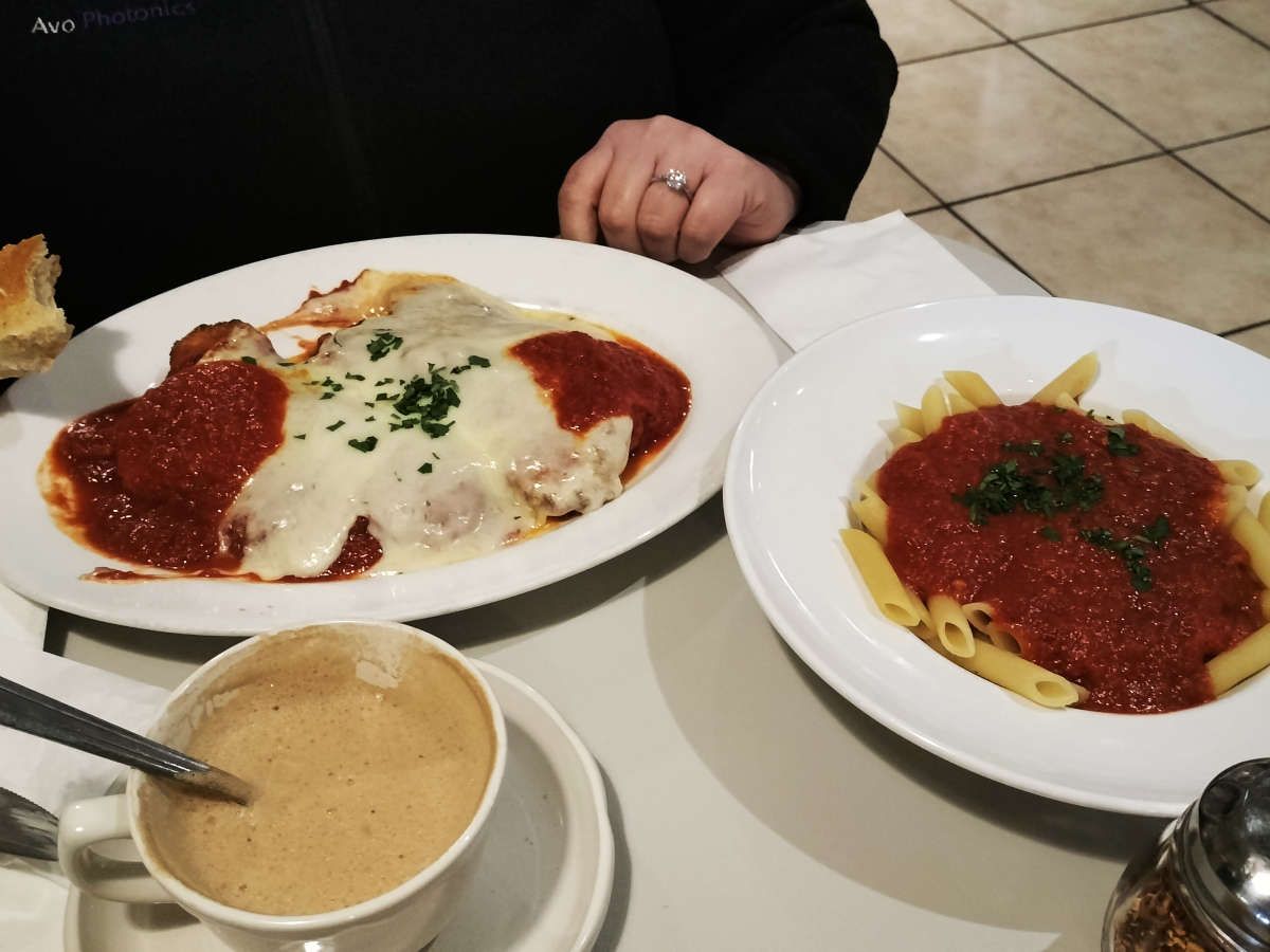 The place was packed! But the atmosphere was nice and the food was great. Riley got chicken tenders, Kevin got a sausage pizza, and I had chicken parmesan with a side of penne and a salad (and a cappuccino).