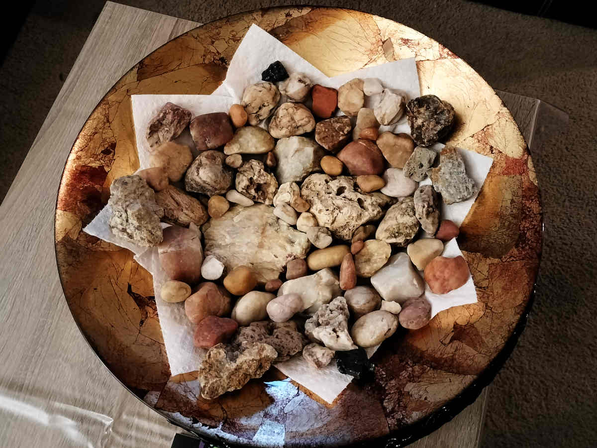 Kevin has been wanting something to showcase all the rocks and pebbles we find together and bring home from our park outings, so we made a quick stop at Good Stuff Thrift and found something fancy looking that didn't break the bank (and we don't have to worry about feeling too bad if it ever breaks):