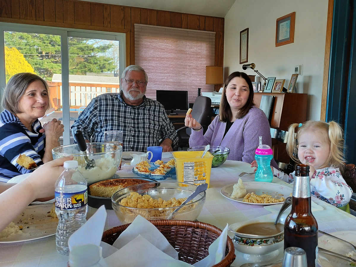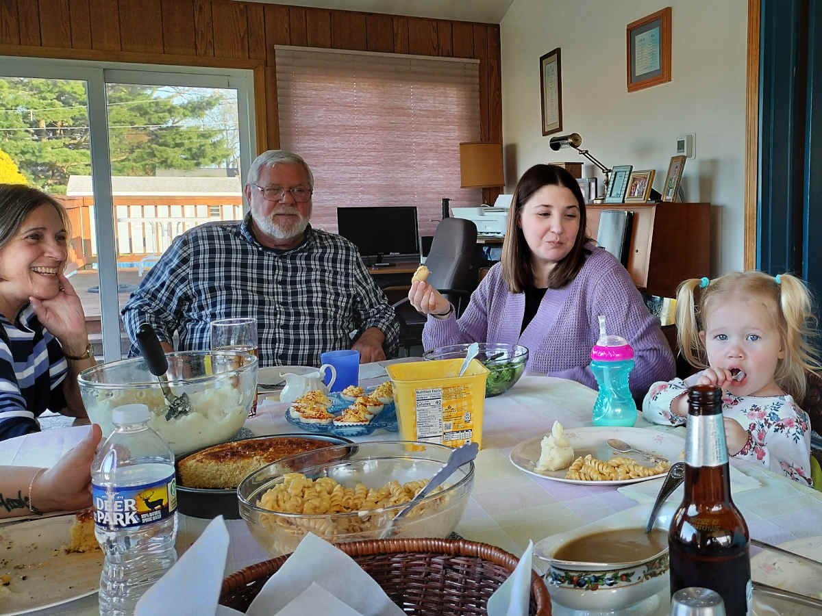 Then we had a lovely dinner with chicken, corn bread, mashed potatoes, macaroni and cheese, broccoli, deviled eggs, and cresent rolls: