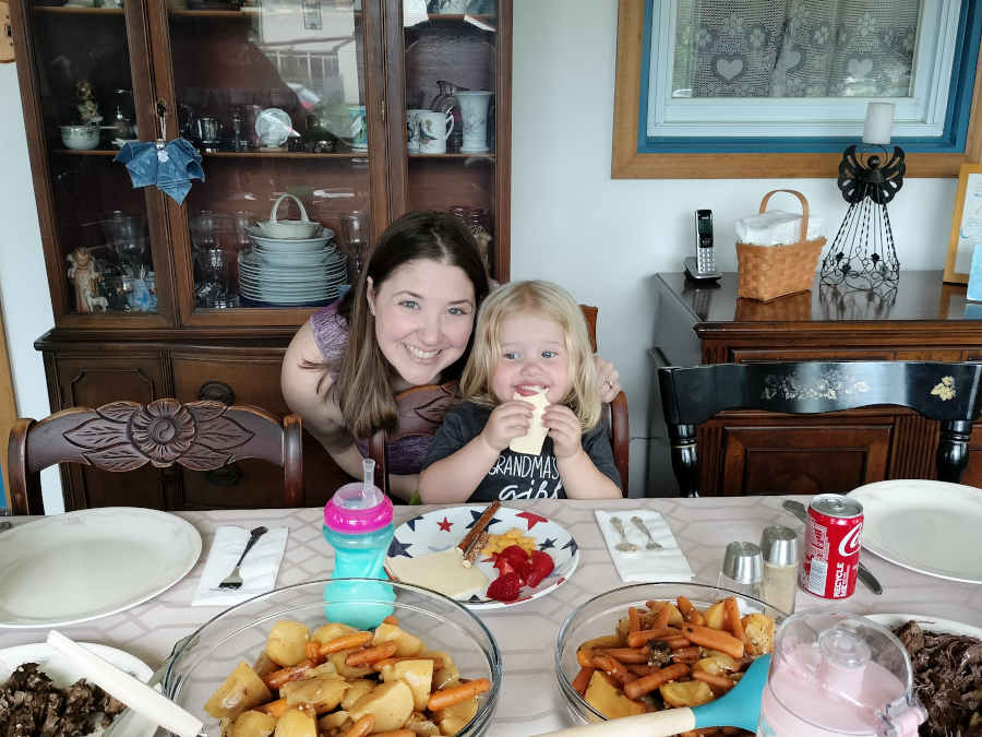 Liv opted for pretzel rods, goldfish, and a few slices of American "cheese"; but, for the rest of us, Kelly prepared an amazing slow-cooker beef roast with potatoes, carrots, and onions...