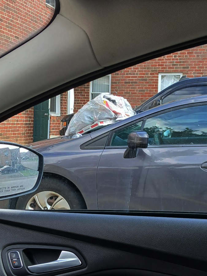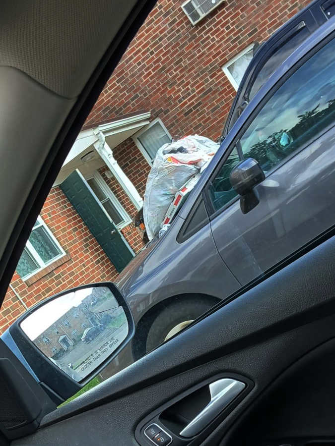 Last Thursday afternoon I got home from work to find our neighbors Rob and Nicole's trash all over the hood of Nicole's car: