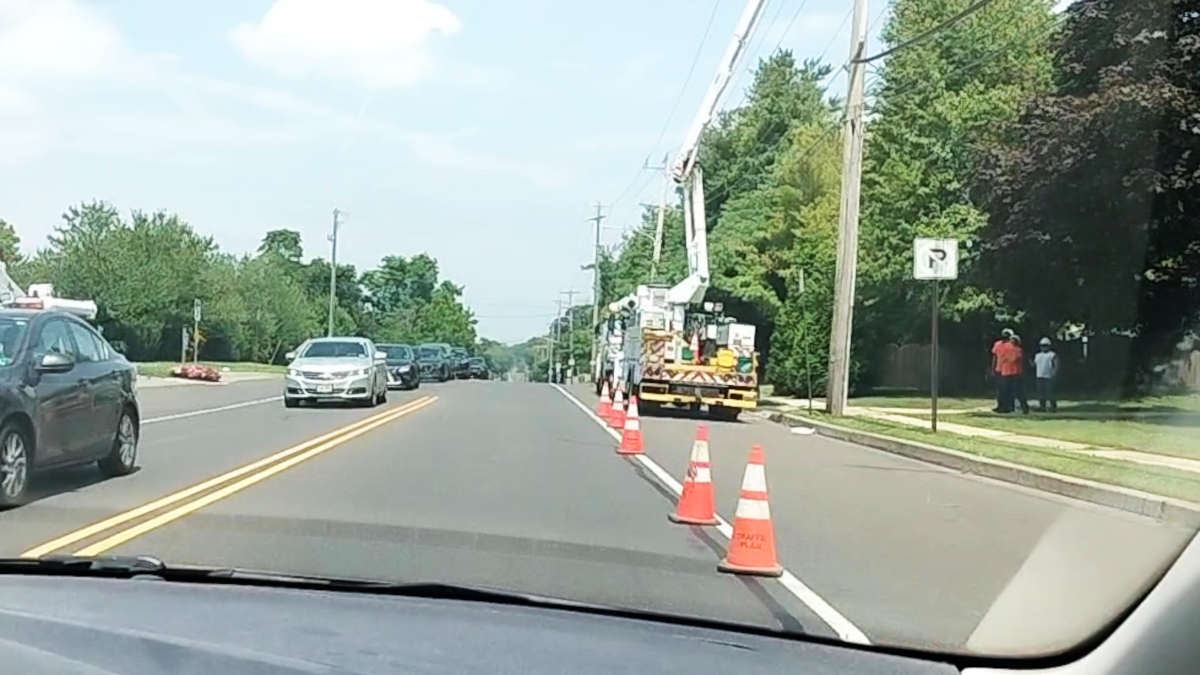 The guy up in the bucket was disconnecting the wires going over the street, and we got to sit there for four minutes and 27 seconds while one guy did work and about 27 other guys stood around and watched: