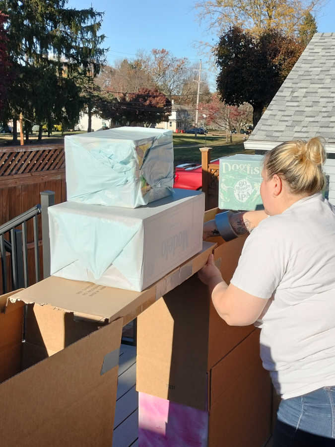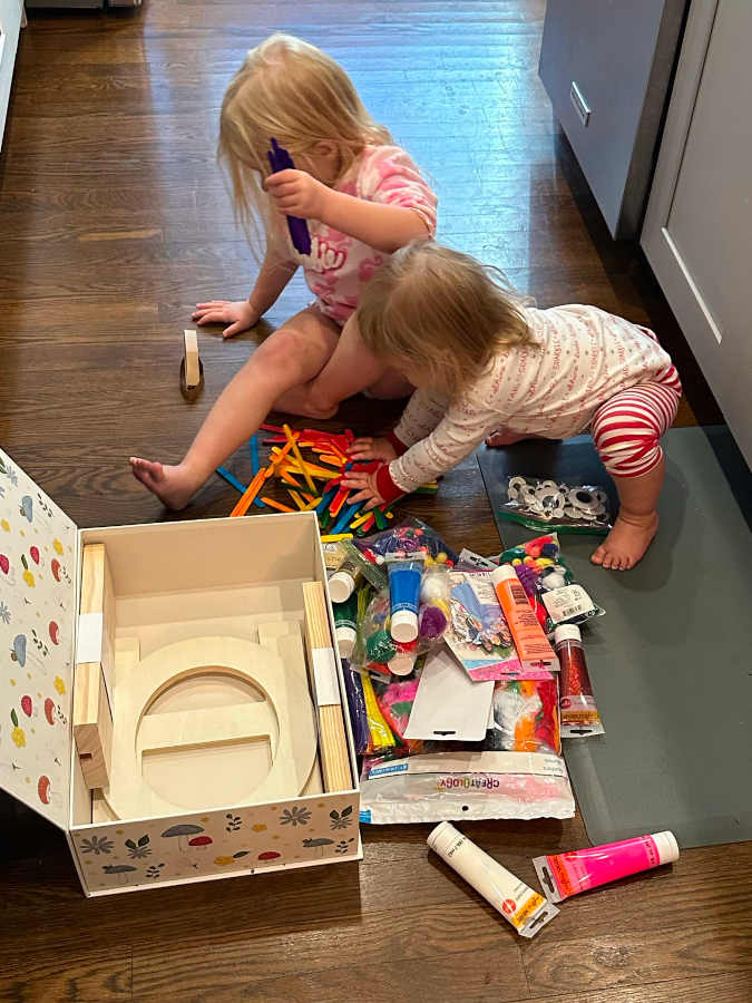 Matching boxes packed with stickers, coloring books, art supplies, and a bunch of wooden shapes and animals to paint...