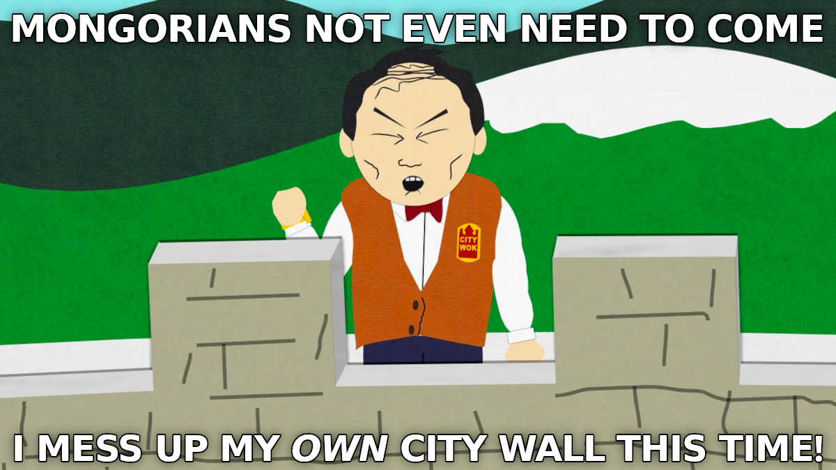 The whole thing definitely had a low-rent feel to it that brought to mind the Mongolians of South Park destroying the Great Wall of China...