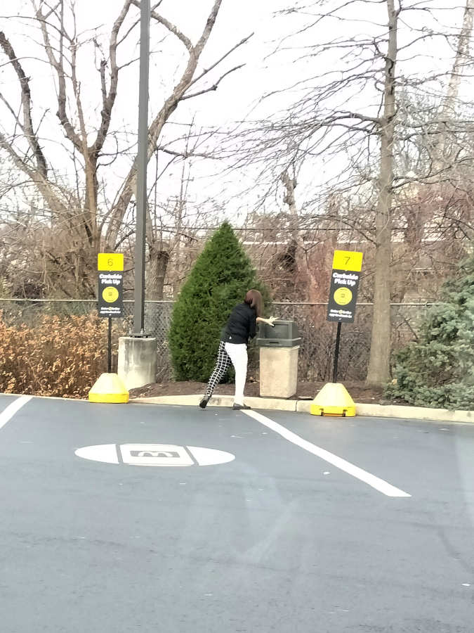 Perhaps she was a member of Mother's Against Drunk Driving, and she was putting a "Thinking of suicide?" notice on the side of the trash can: