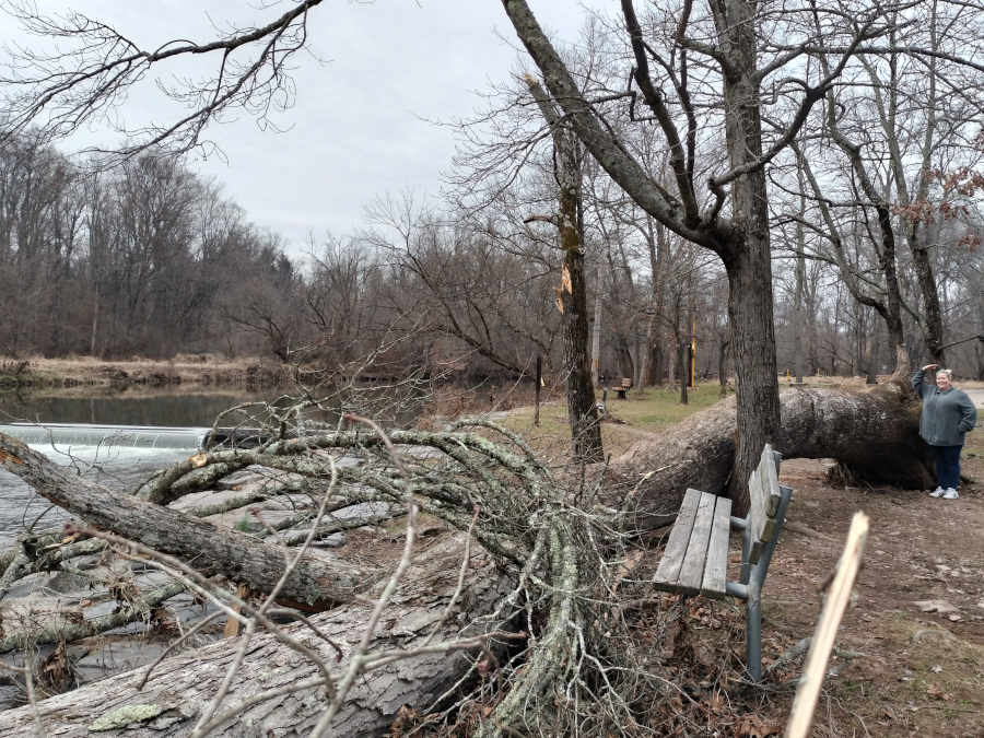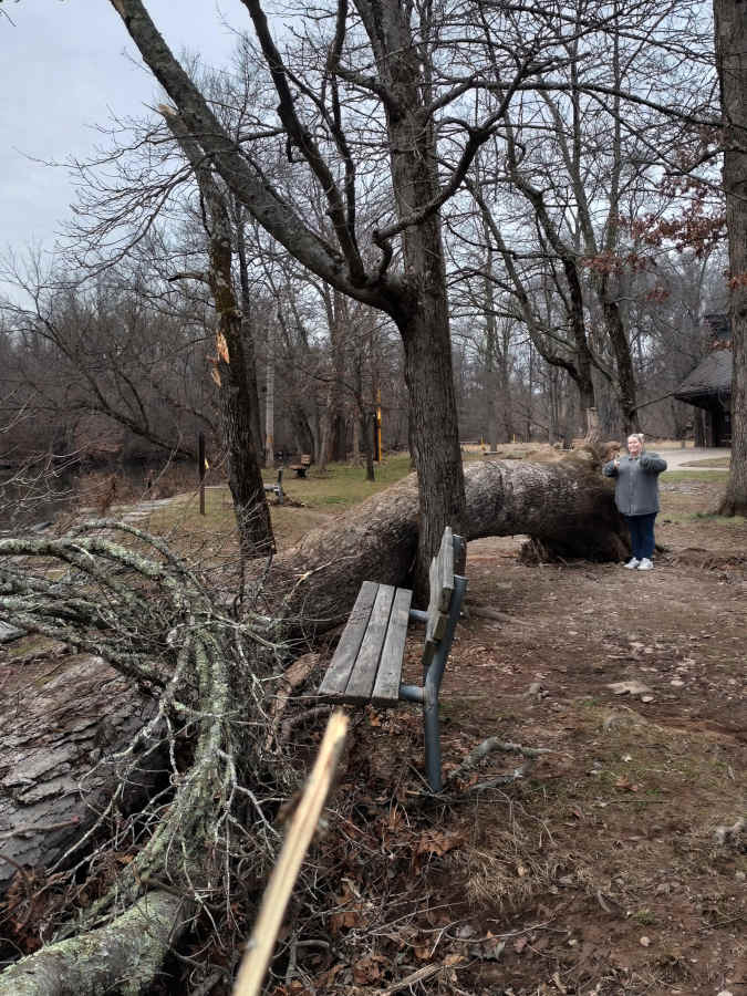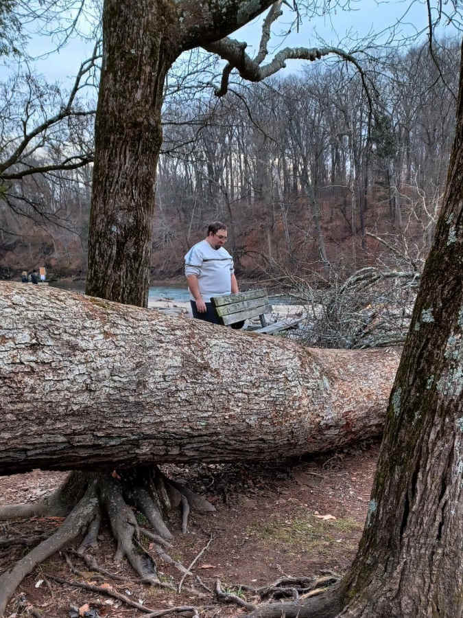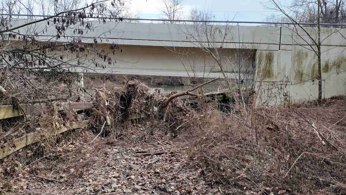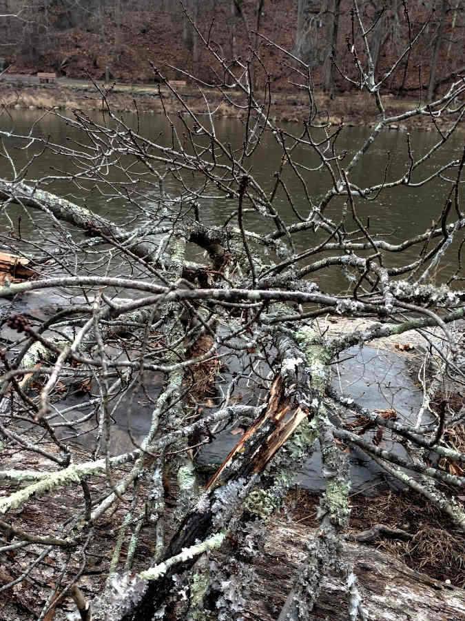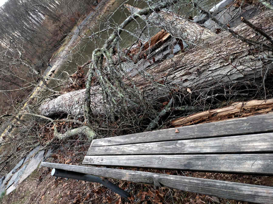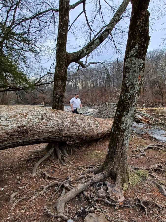 ...And yet, the creek pushed it around like it was nothing! (You can see that it sheared off some branches of neighboring trees when it fell perpendicular to the creek, but then the force of the floodwaters rotated it about 90 degrees counter-clockwise by the time the creek receded again.)