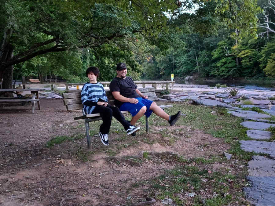 This is my favorite bench: the one that's four feet off the ground for no reason—where Riley and I sat and swung our feet that one time last September...