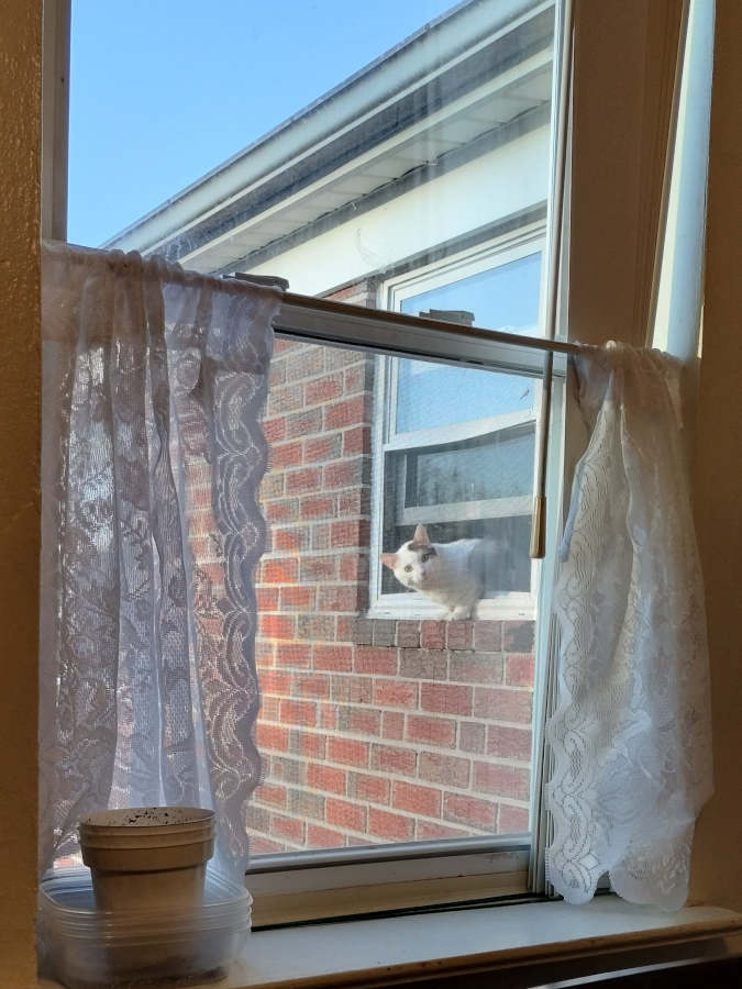 And so, this cat—cute as he is—has been left to punch a decent-sized hole through the window-screen in the common stairwell... which is pretty crappy behavior even 'round these parts.