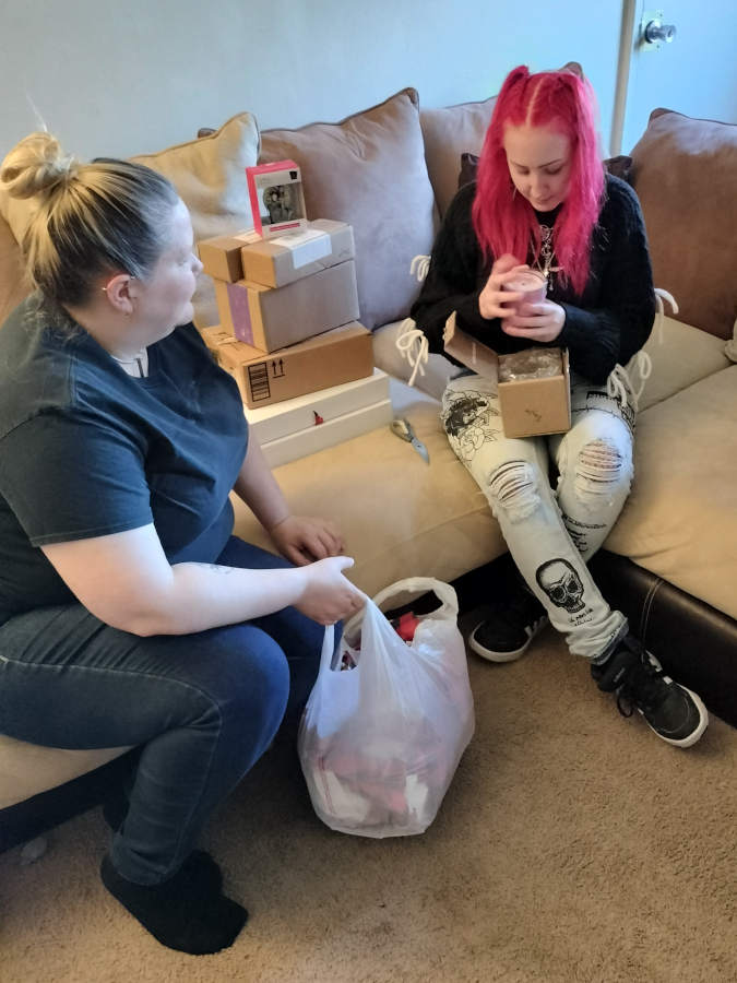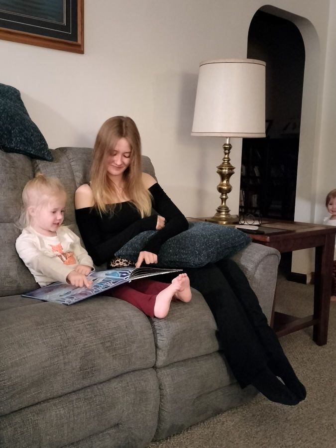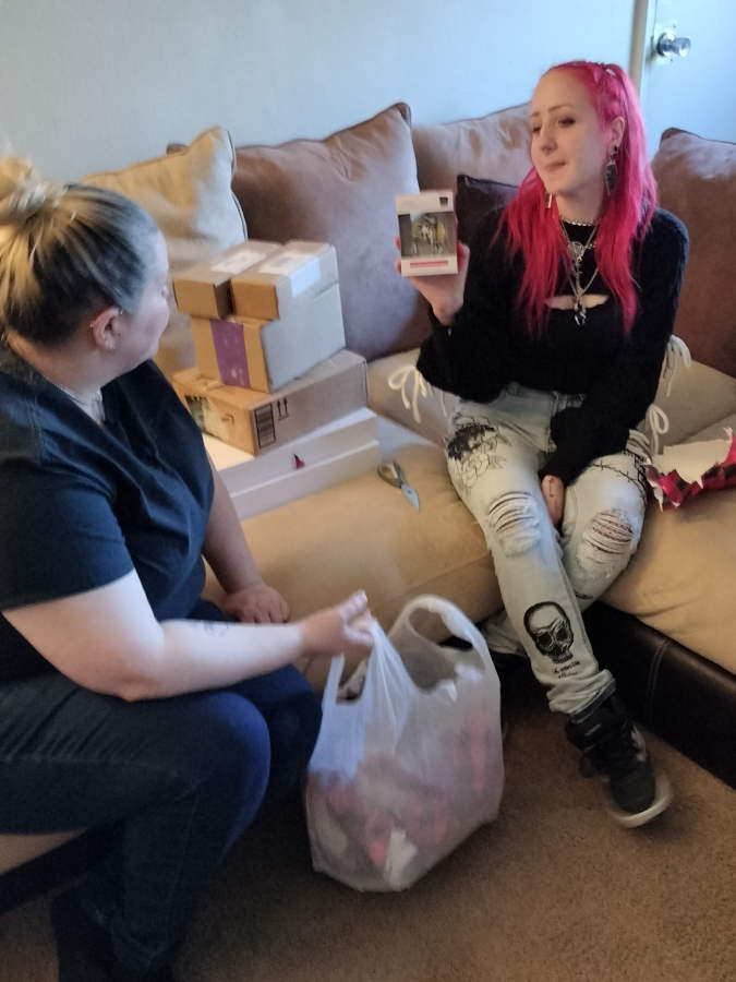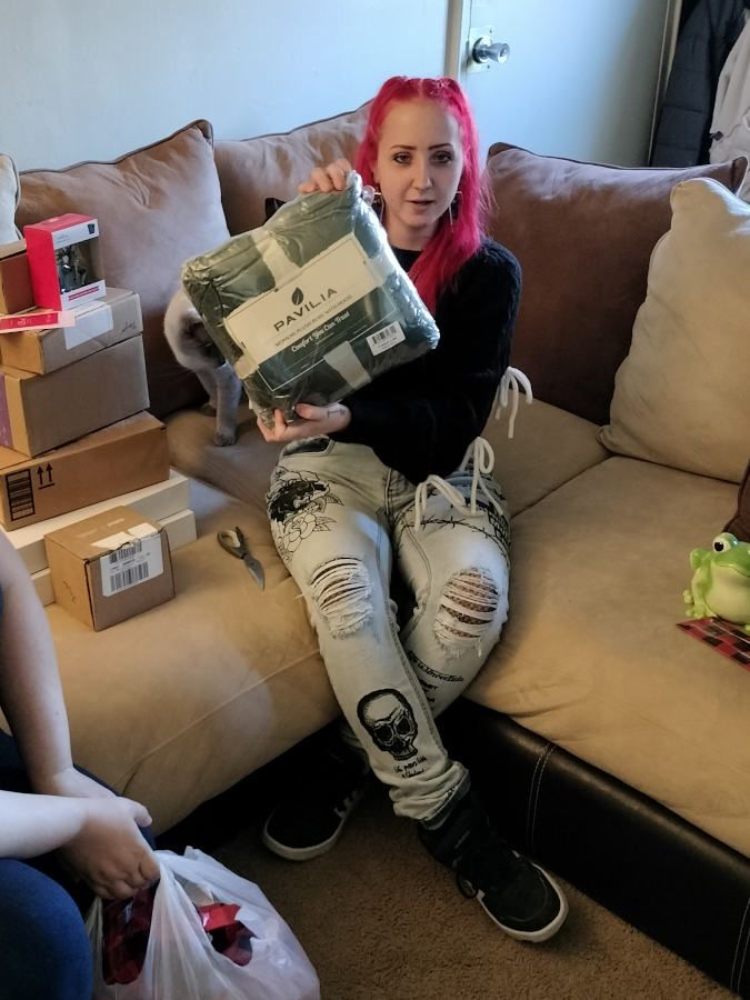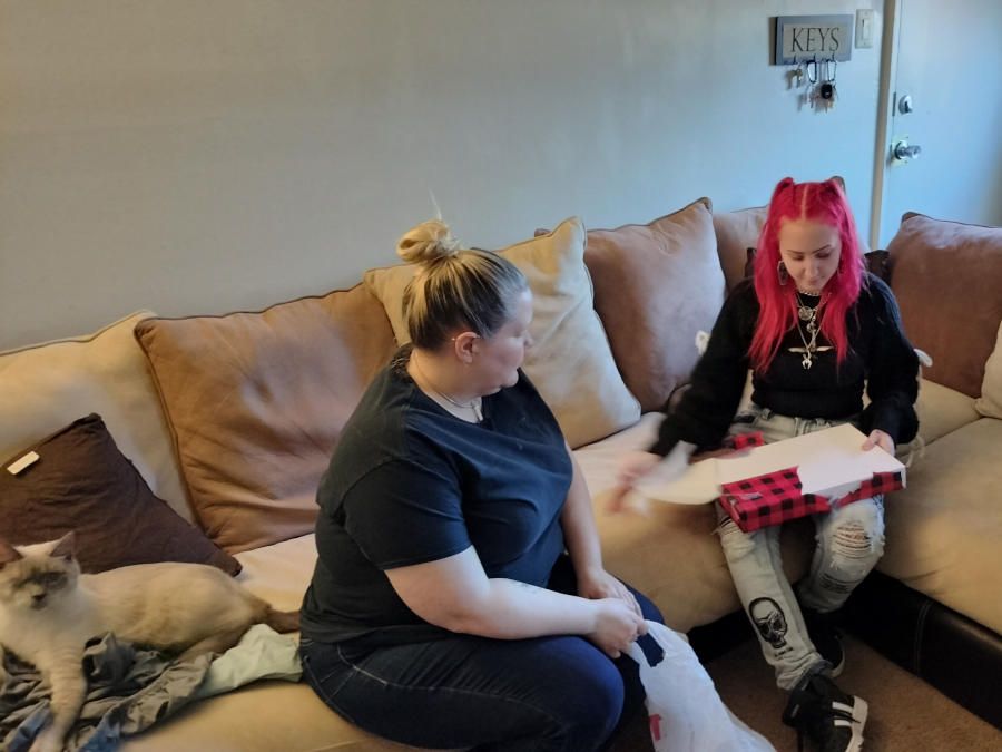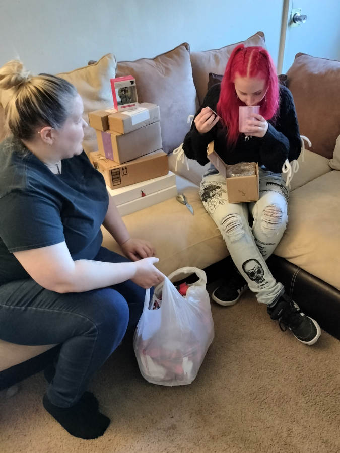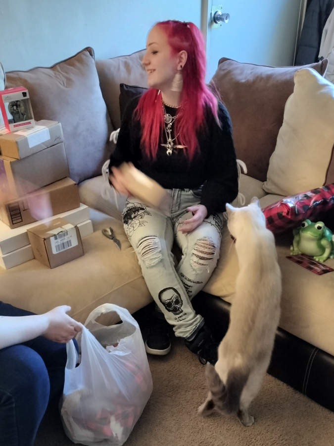 Taylor, Ahlina, and Ahlina's sister Damiante stopped by briefly while they were down from Connecticut for a concert in Reading; so we took the opportunity to give Taylor her Christmas presents so Athennia could watch her open them in person.