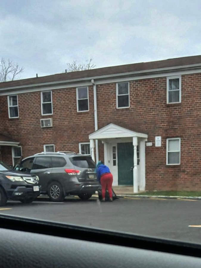 On her way out, she snapped this pic of our neighbor Ruth ("Barnyard") illegally parked in the handicapped space—and apparently dressed to show her equal-opportunity support for the local street gangs...