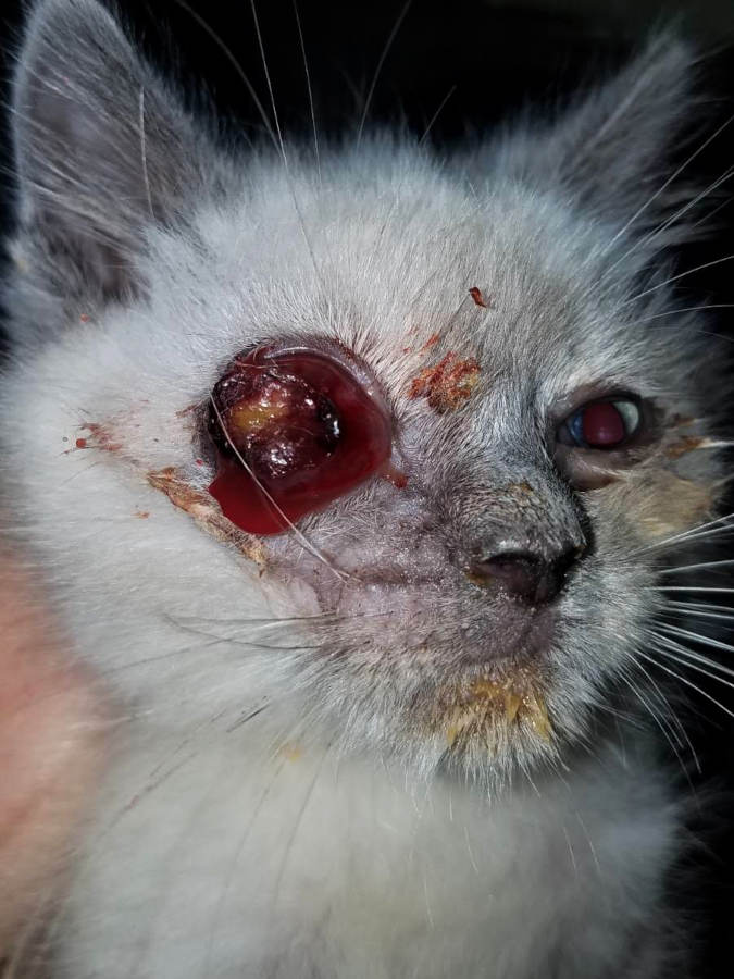 He eventually required surgery to remove the eye entirely; and in the meantime, he also had a double hernia that required extensive surgery on its own!