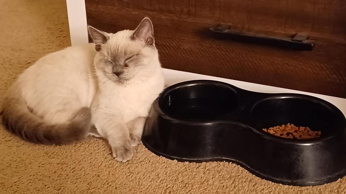 He scoured every inch of our bedroom until he was finally so tired that he practically fell asleep in his water bowl: