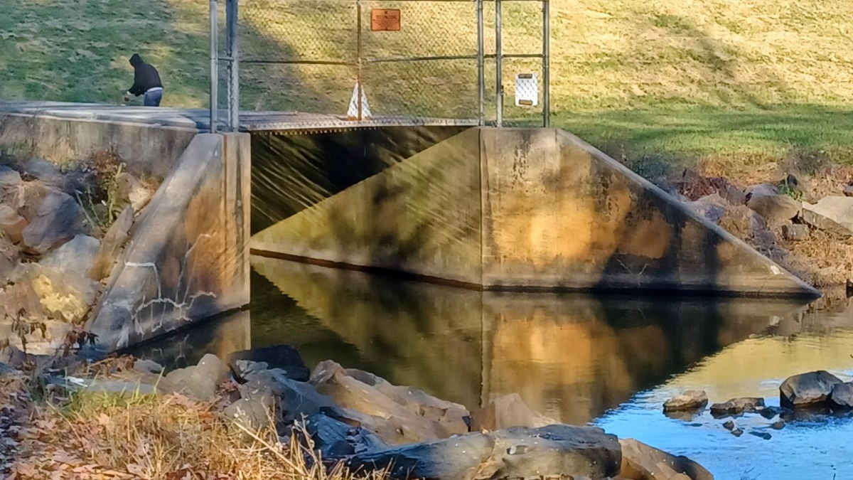 We made our way down and said hi to the random guy hanging out down there by himself. He said his English wasn't good; but, we gathered that he was fishing in the overflow outlet from the lake.