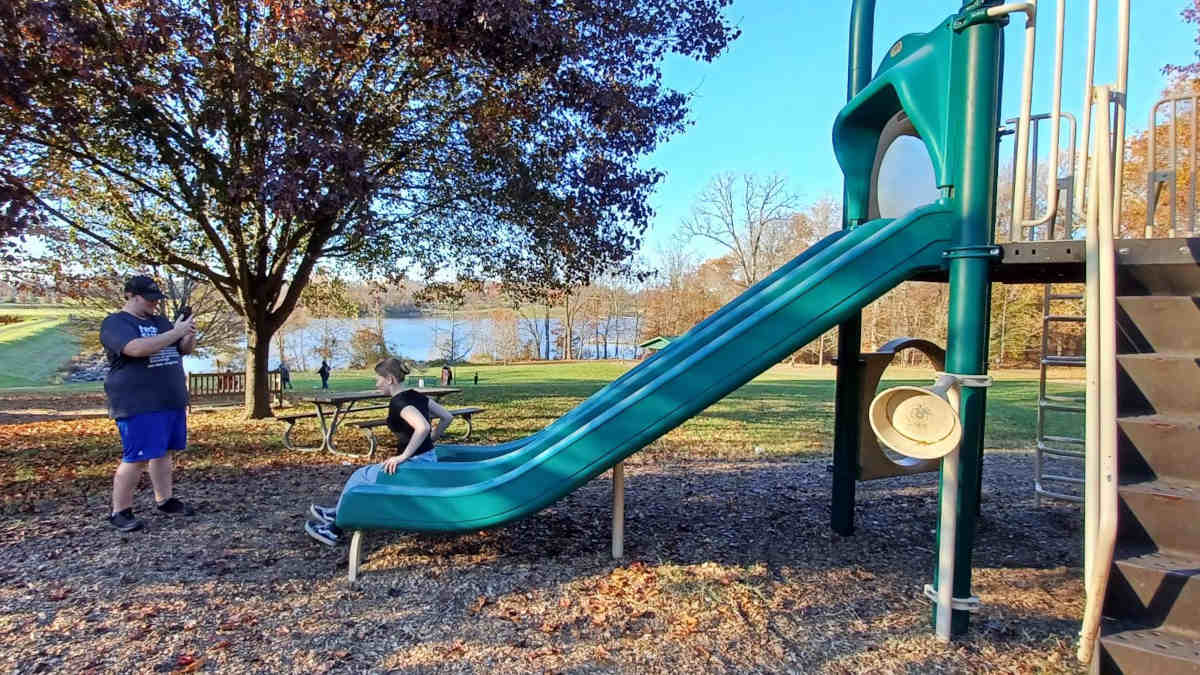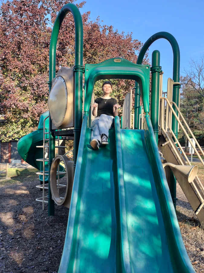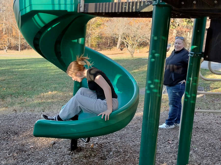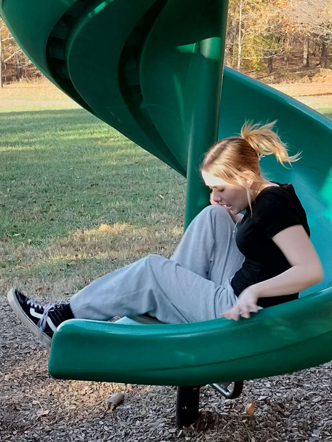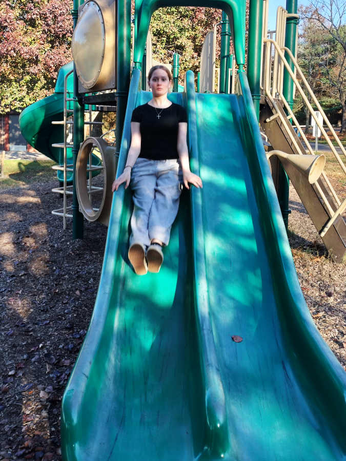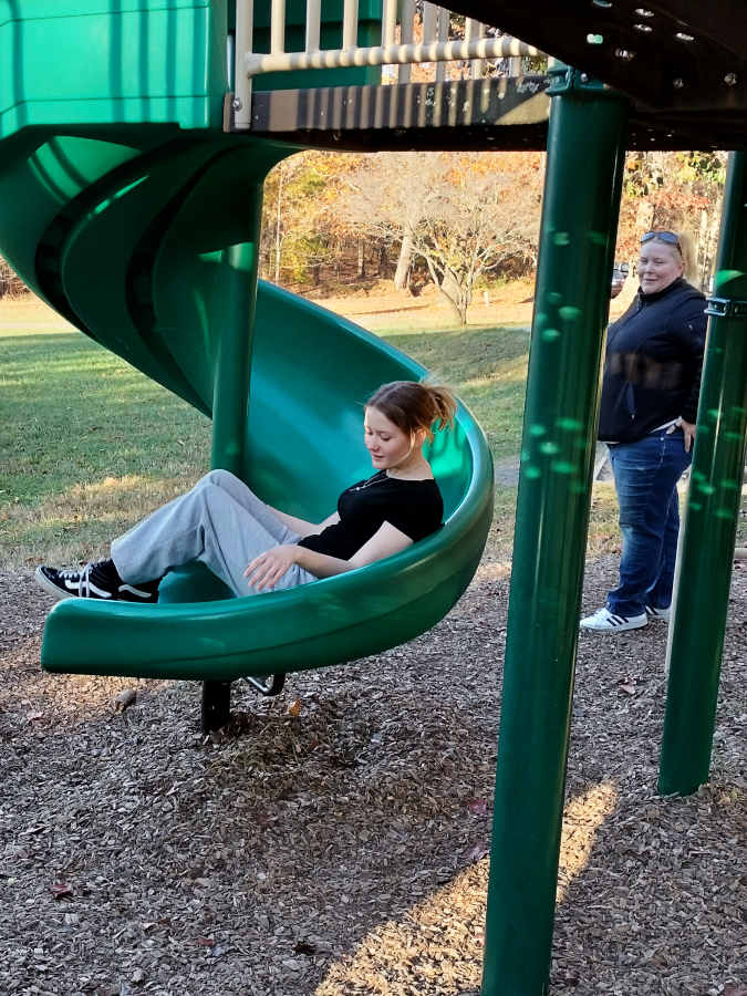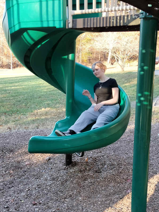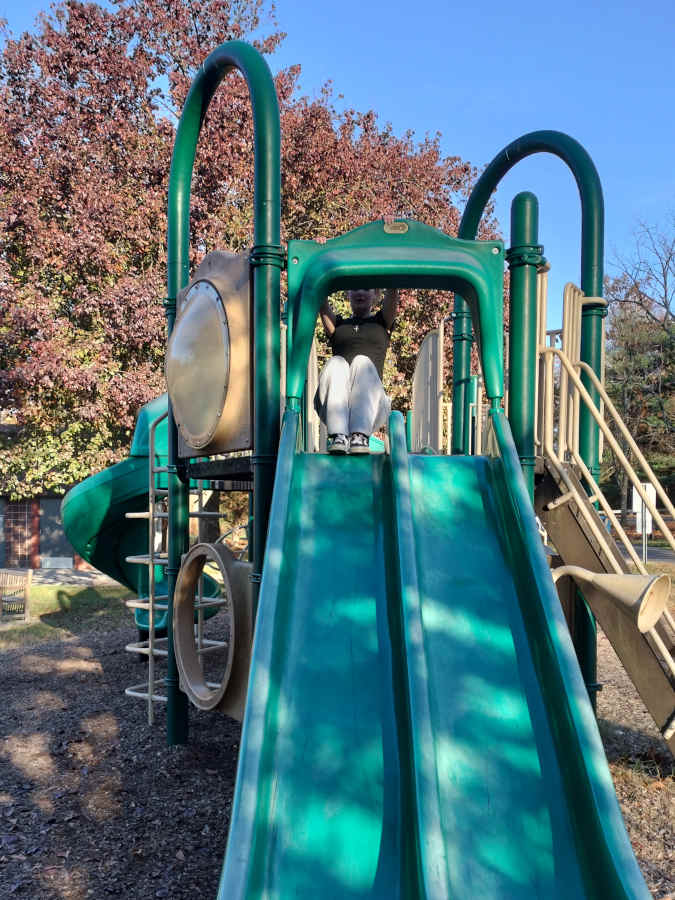 Fortunately there was a second slide for Riley to enjoy on the other side of the playground; and we snapped pics of it like she was a toddler going down a slide for the first time...