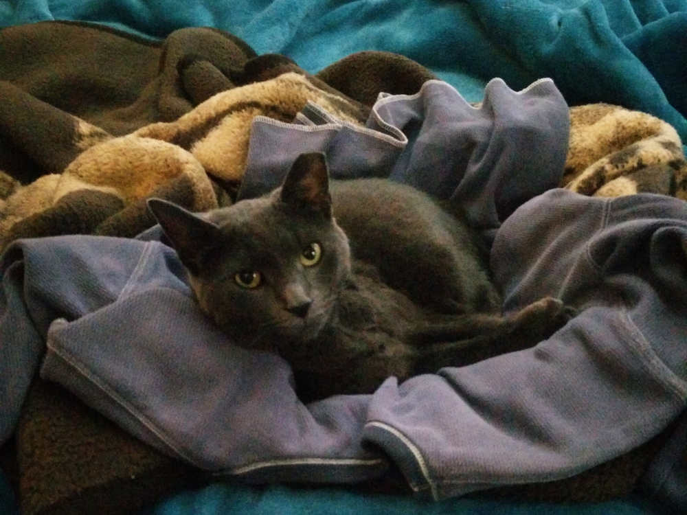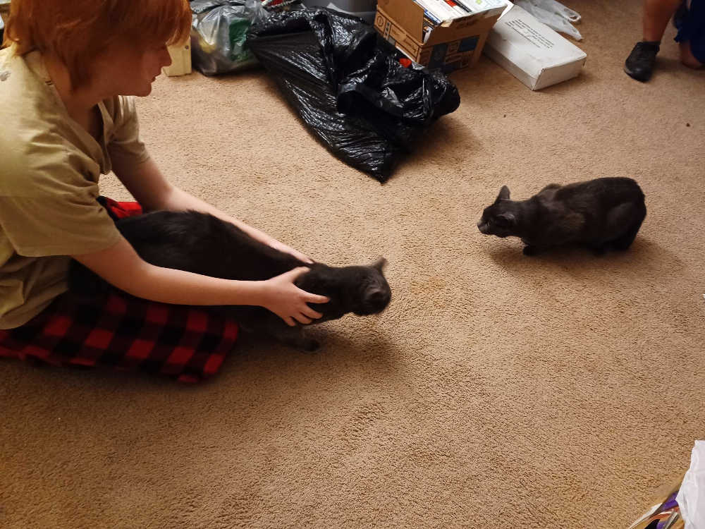 Friday evening, Athennia and I took Penny over to the apartment to meet Lucky just for half an hour or so. We'd been planning it since earlier in the week and gave both cats a heads-up by swapping an old sweatshirt of mine to let them get used to each other's scent.
