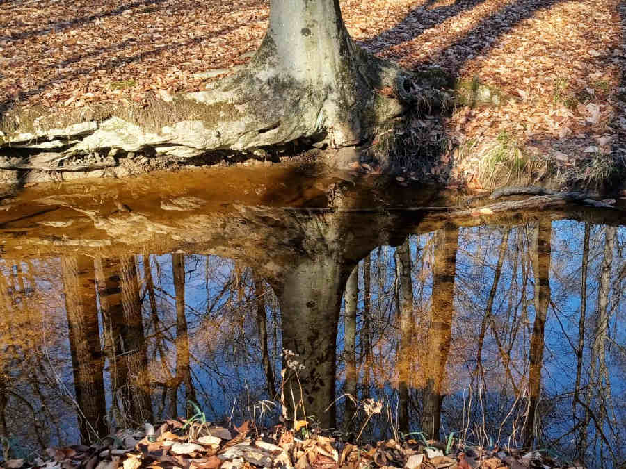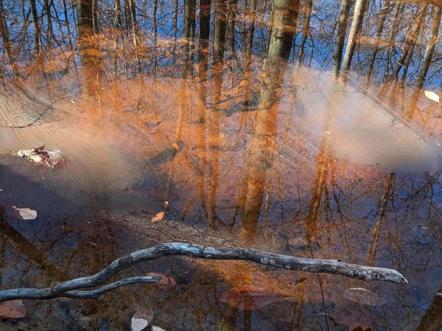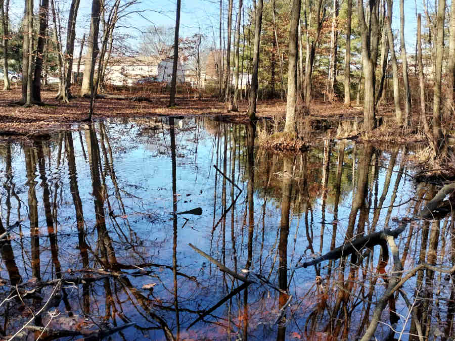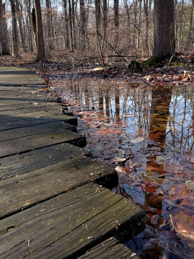 When we got back in the vicinity of the parking lot, I bent down to try to get a close up of the swamp puddle that's always there just inside the edge of the woods. And I slipped on one of the mossy planks and nearly went in, so that was the end of that!