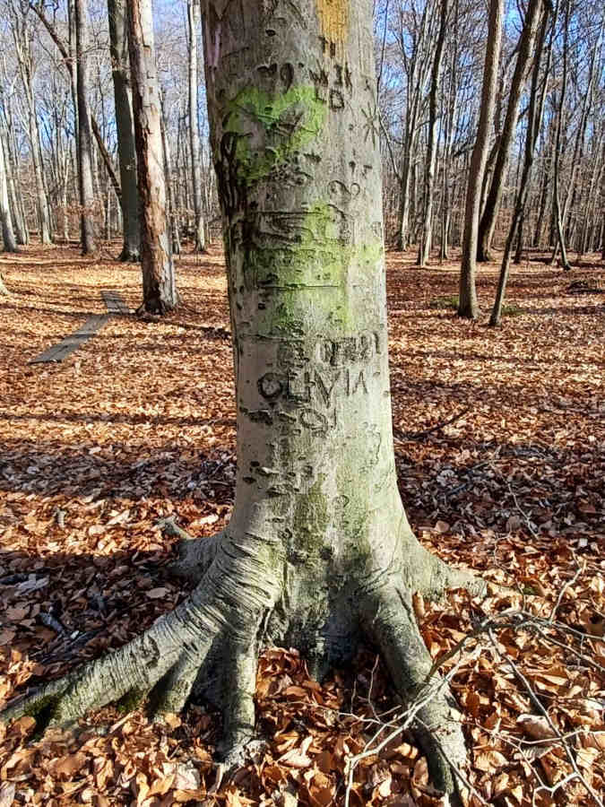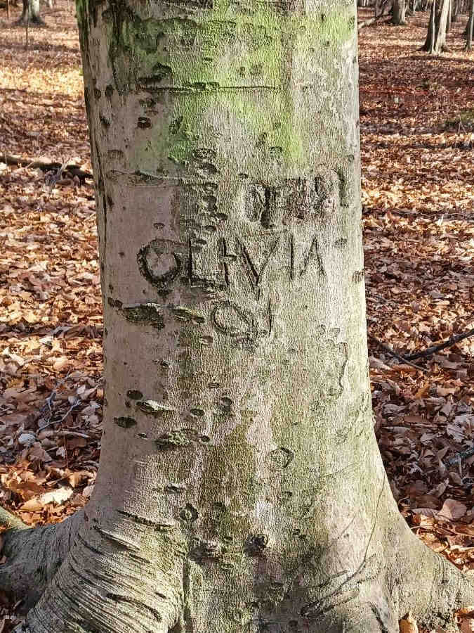 Just before we headed out, we walked by a tree with a bunch of names carved in it.
