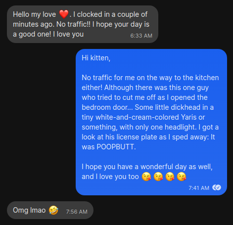 Thursday was quiet by comparison, although Kevin and I shared an early morning laugh. I always text him to let him know that I made it to work okay, and then he texts me back when he wakes up.