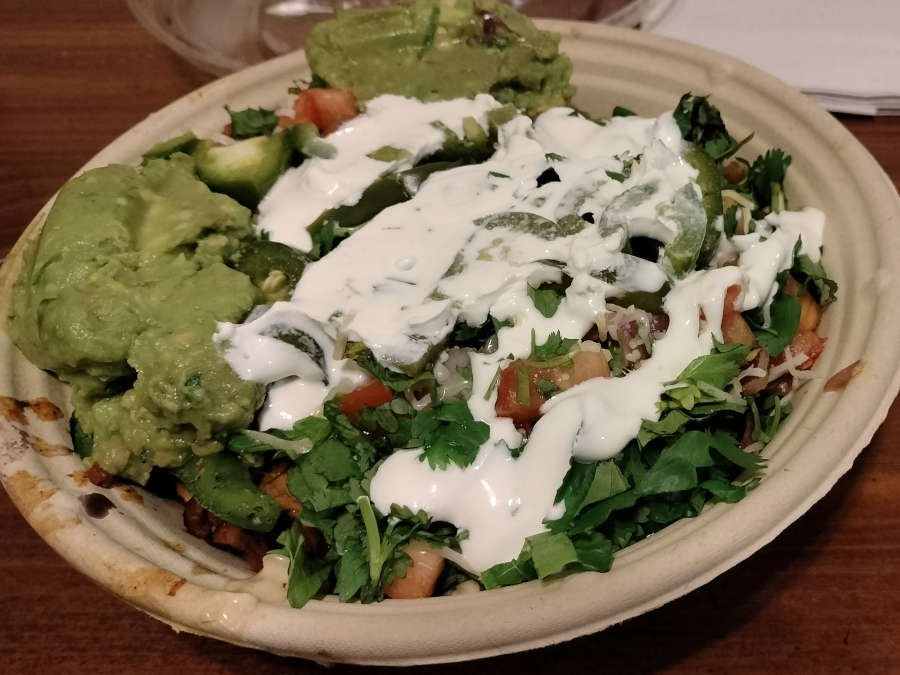 Last time we got Qdoba, some new kid made our bowls and barely put anything in them. But I guess tonight's guy wanted to make sure our Navidad was muy felis!