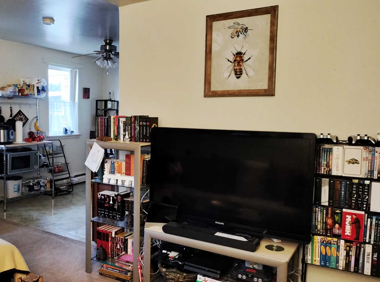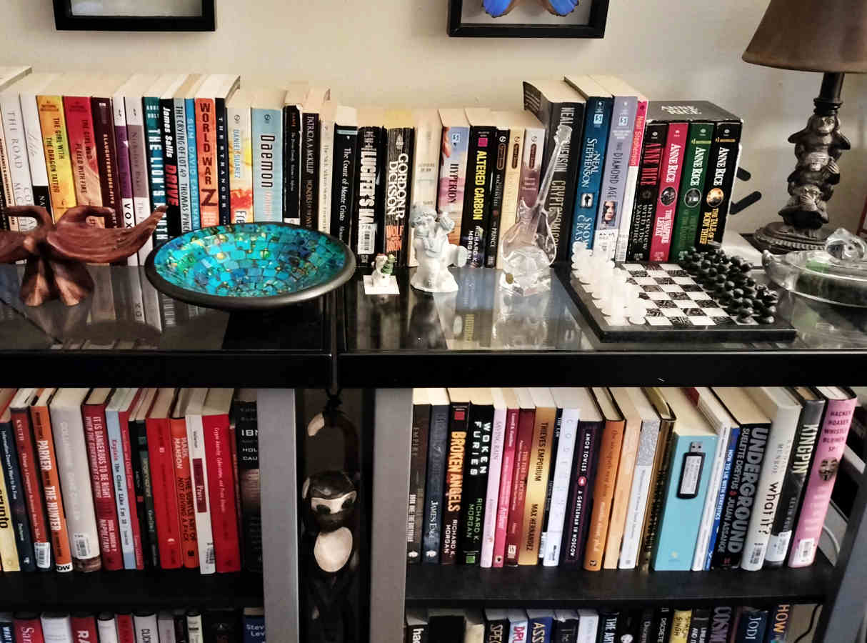 We're making use of our matching corner shelving units—one of which you may recall that we snagged for free last month when Amazon delivered it to the wrong house and then told us to keep it along with the free replacement they sent out...
