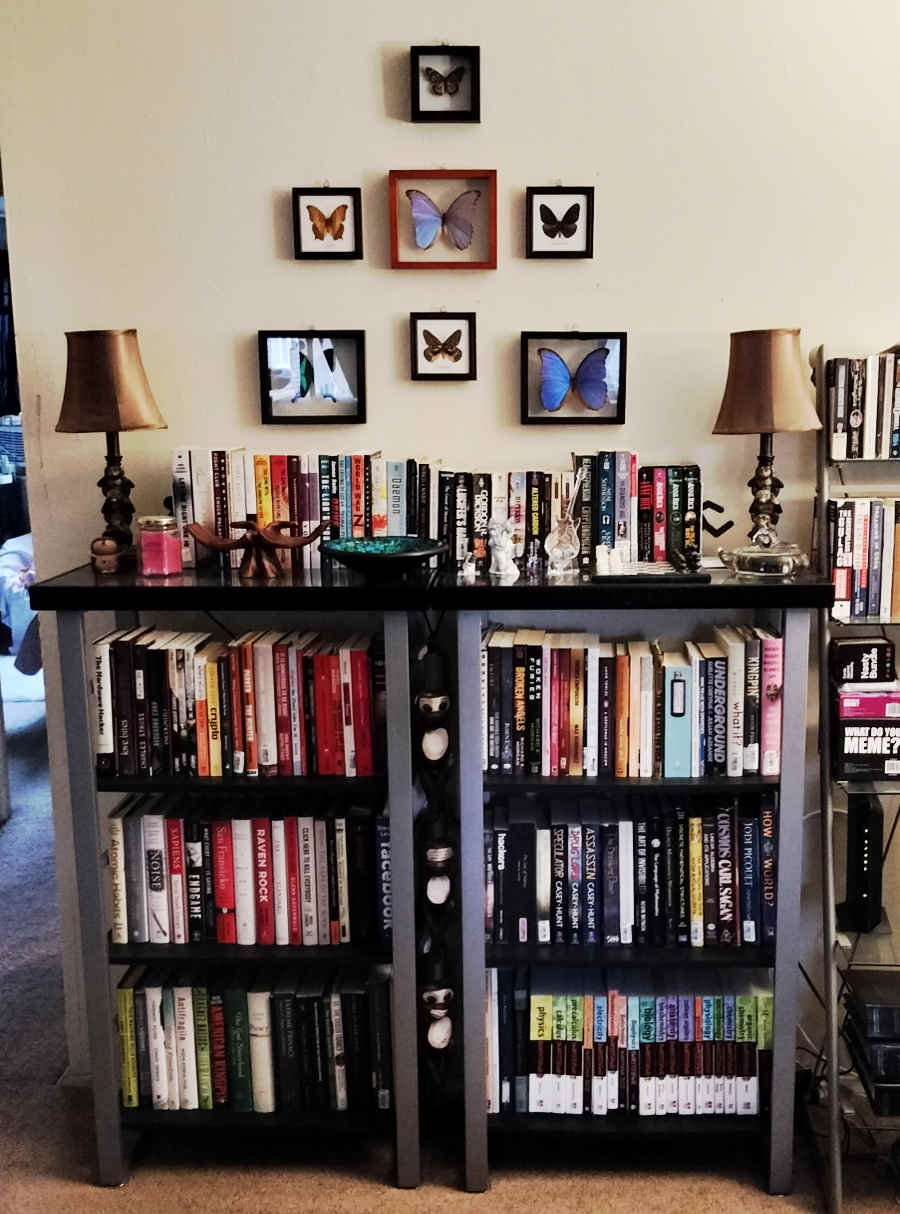And, my new mosaic bowl and hedgehog figurine (hard to see, between the bowl and the snowman)—and Athennia's butterflies (which I recently rehung about nine inches higher so they aren't half hidden behind my books anymore)...