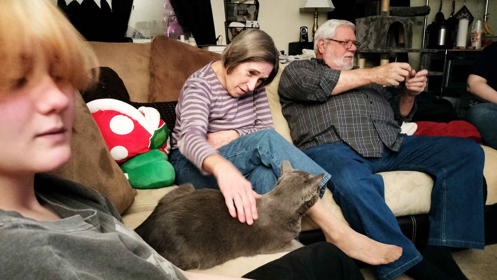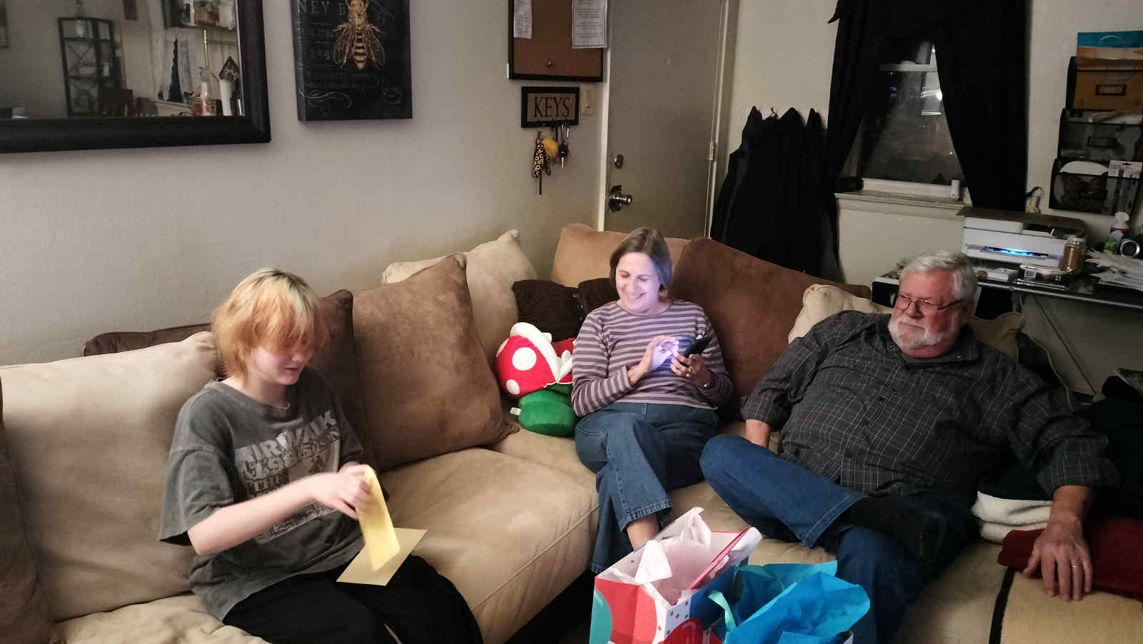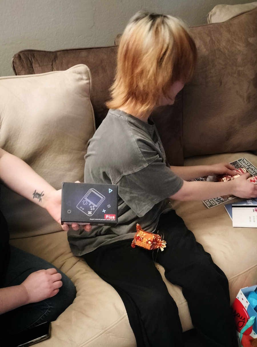She and I jointly gave Riley a handheld video game console that emulates a few hundred retro games. (Thanks to my cousin Pete for the idea: he showed his off when we visited at the end of December, and Riley enjoyed playing with it.)