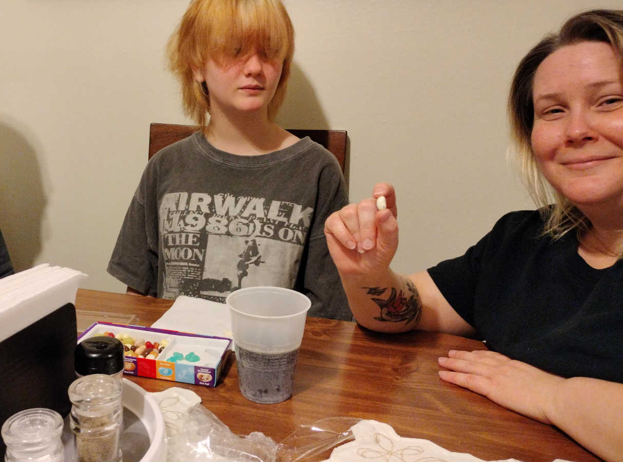 We ordered pizza from Bambino's, and then I surprised Riley with a pack of Beanboozled jelly beans she had mentioned while we were at Friendly's a few nights before New Year's Eve :)