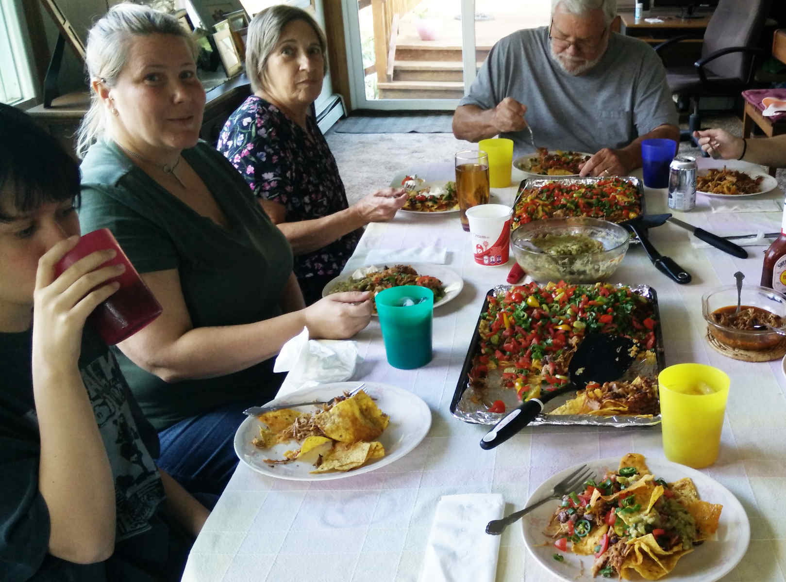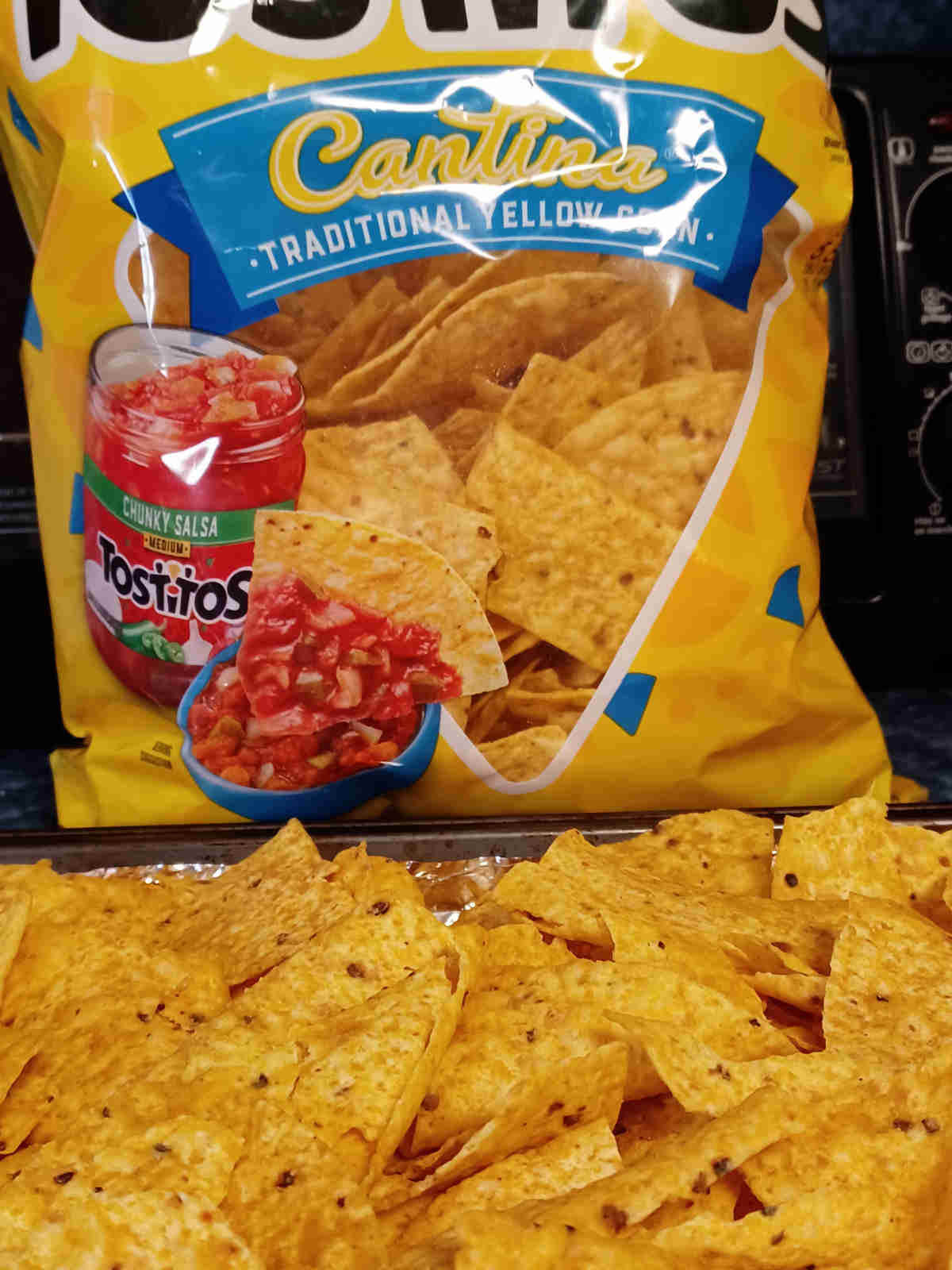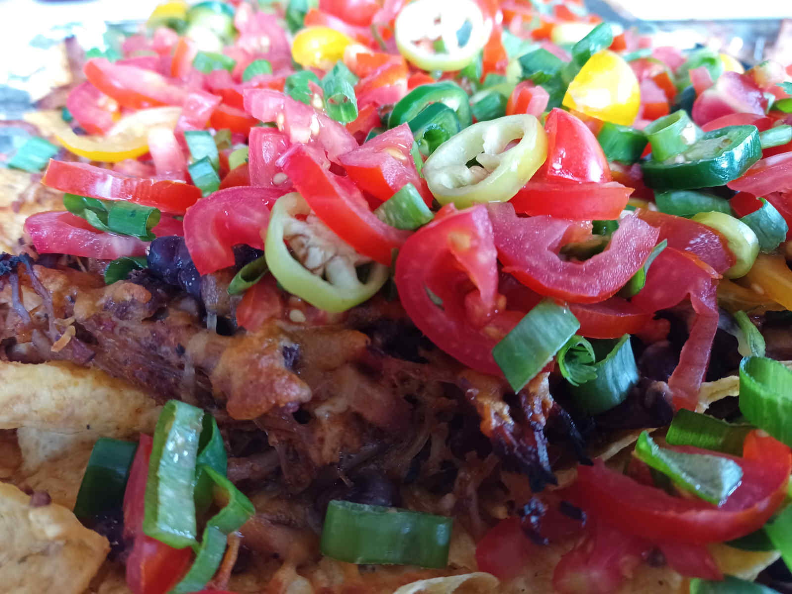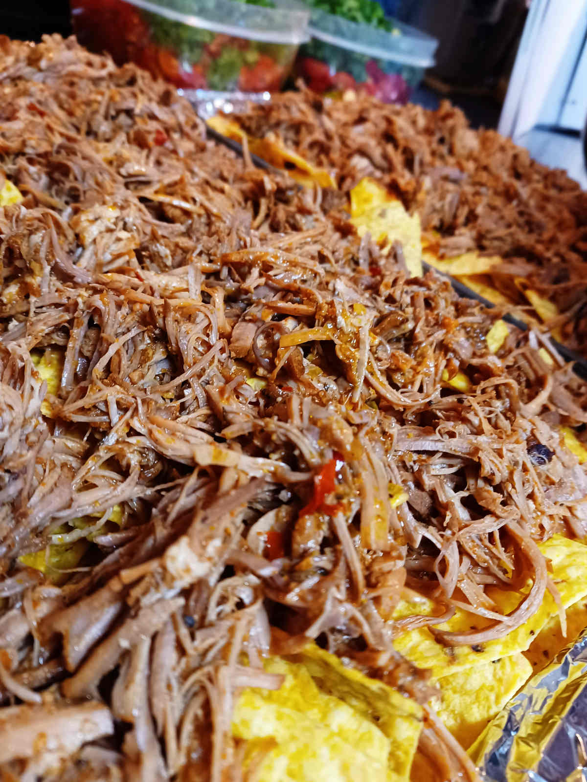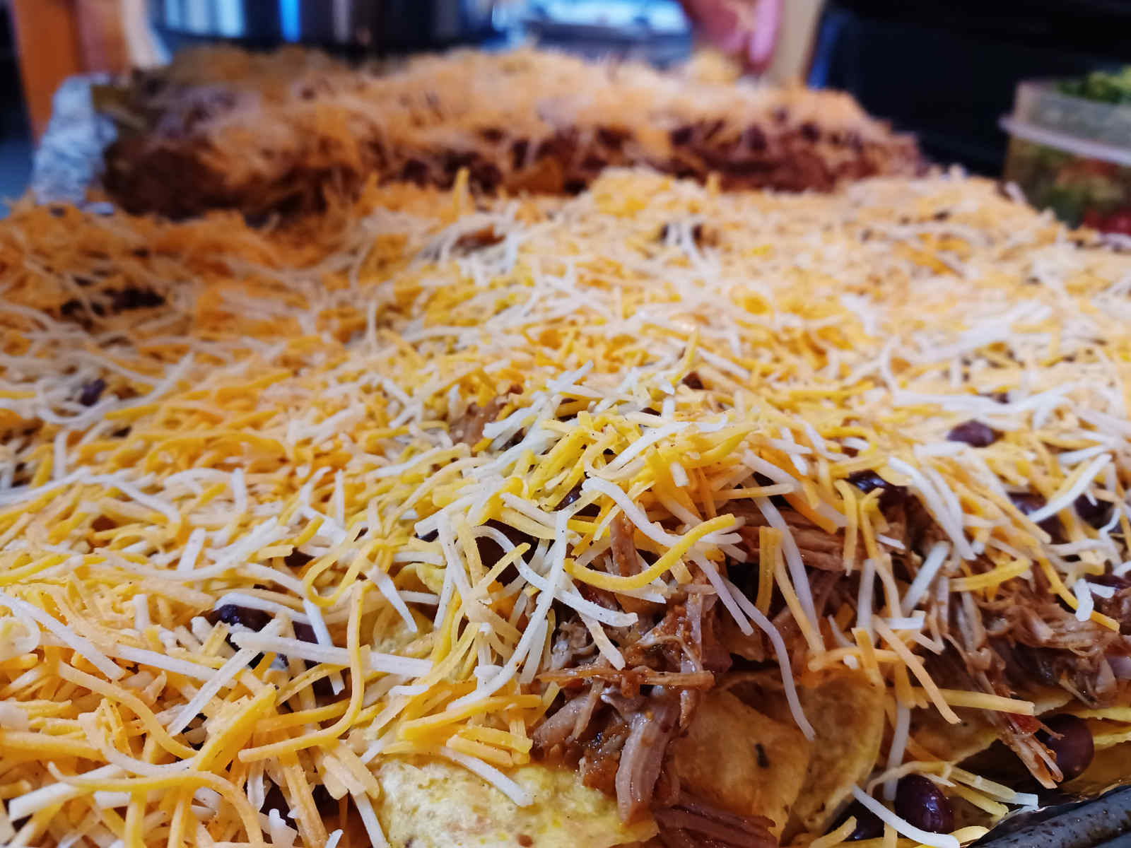 Then he piles a base of tortilla chips with layers of pork, black beans, and plenty of cheese, bakes it at 400 degrees for 10-15 minutes, and covers it with pico de gallo and a squirt of lime juice:
