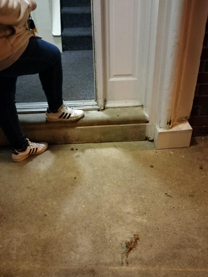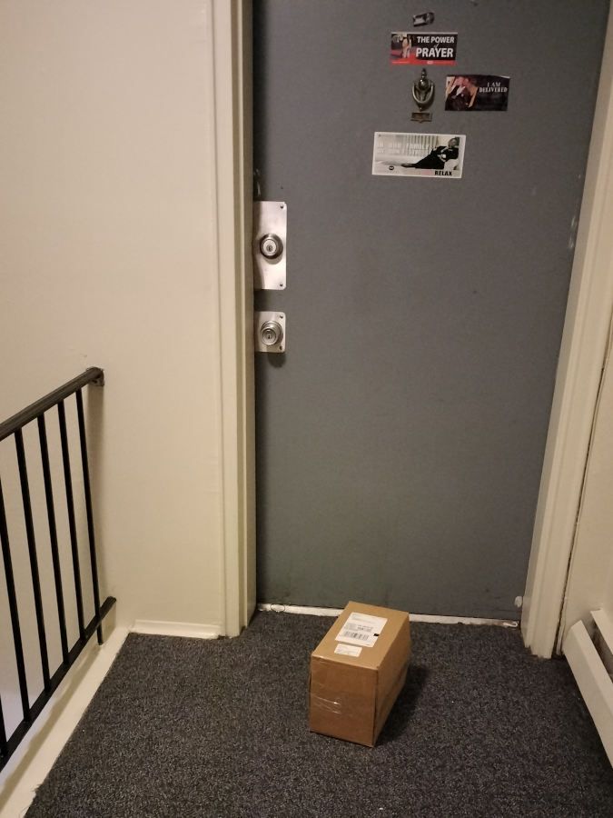 ...steps right over her own UPS delivery to get into her apartment, like a jackass.