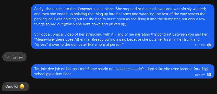 But as I got downstairs and into my car, one of our downstairs neighbors came out with a 5,000 gallon trashbag stuffed to the gills. She ended up blocking me in my parking spot for almost two minutes while she struggled to carry-drag the thing along at a snail's pace.