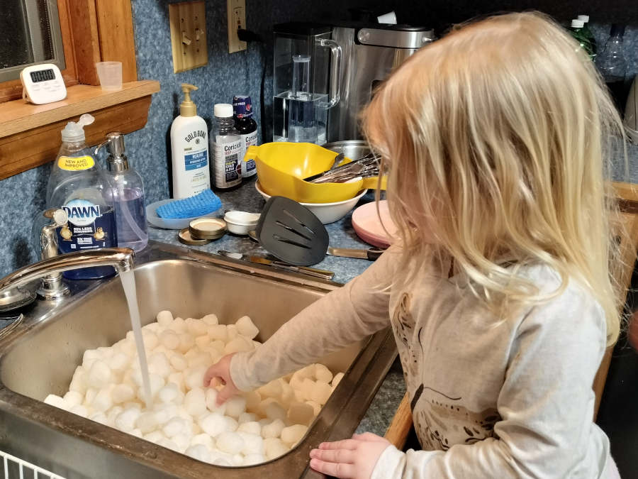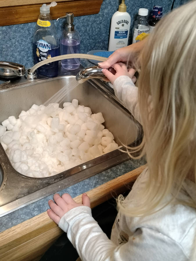 But first, one of the boxes we had cleaned up the day before had been filled with packing peanuts, and Kevin discovered that they were the biodegradable kind.