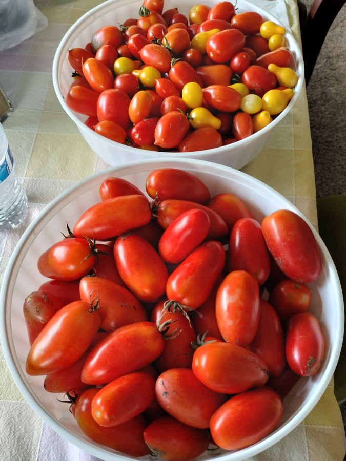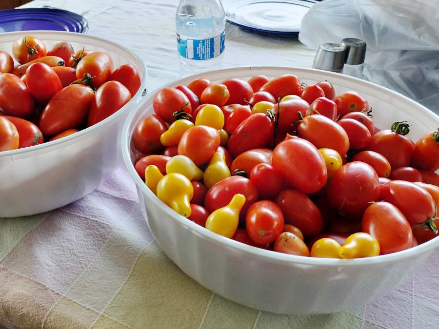 This called for some crowd-sourcing: My parents had of course just bought tomatoes earlier that day; so, they only took a few. But, I made some calls to my sister and to my Aunt Sue and Uncle Roy to see if we could dump some on them.