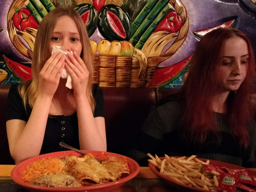 Riley got the chicken enchiladas that she loves there, and Taylor wasn't sure what she wanted, so she texted me a list of ingredients and asked me if I could order her something that had them in it.