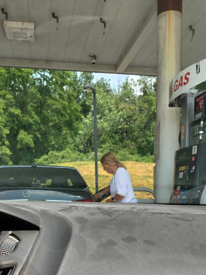 For her first trick, she wanted to pay by credit card but couldn't quite figure out how to slide her card into the one card-sized slot on the entire pump... So, she had to go knock on the glass of the little kiosk, where the 400-pound clerk inside clearly had no intention of coming out to assist her.