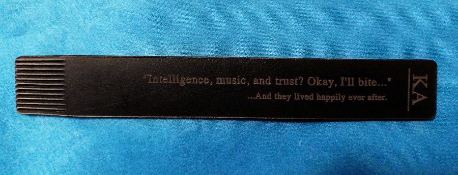When I got to Kevin's present, I was so excited: A beautiful card with an even more beautiful handwritten note inside. Also inside the card was what initially appeared to be a strip of black plastic, but when I picked it up I realized it was a leather bookmark... and there was an engraving on it!