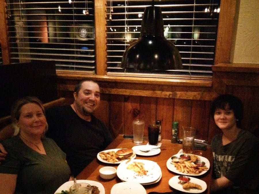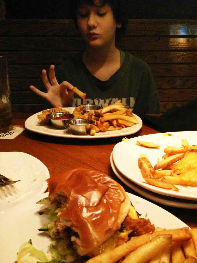 We split an order of loaded Aussie fries as an appetizer, then Kevin got a burger and Riley got her trusty chicken tenders.